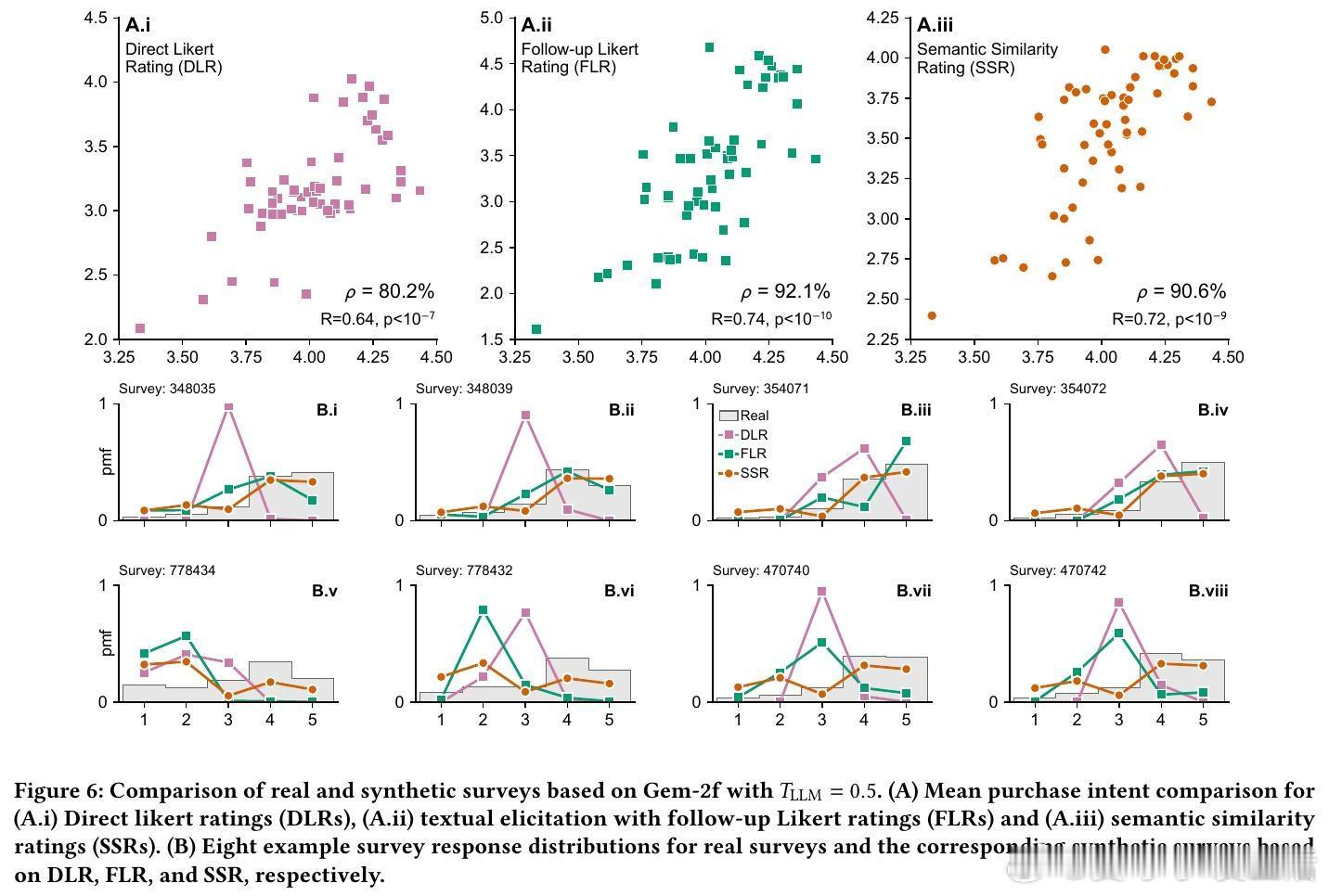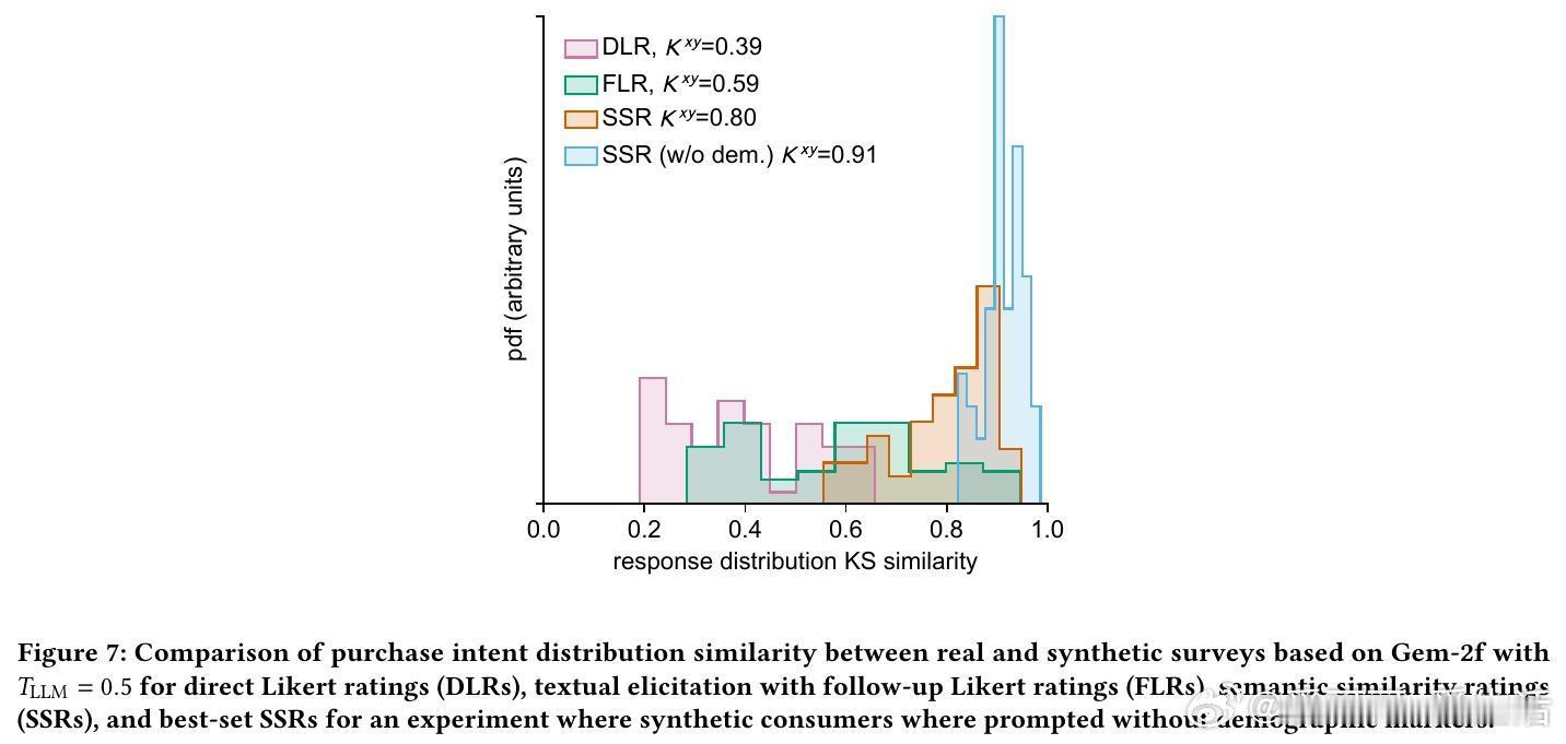 3/ 研究基于57个个人护理品调研(共9,300名真实消费者数据)进行测试。SSR方法达到90%的人类测试-重测可靠性,分布相似度KS相似度>0.85,表现远超直接评分方法。