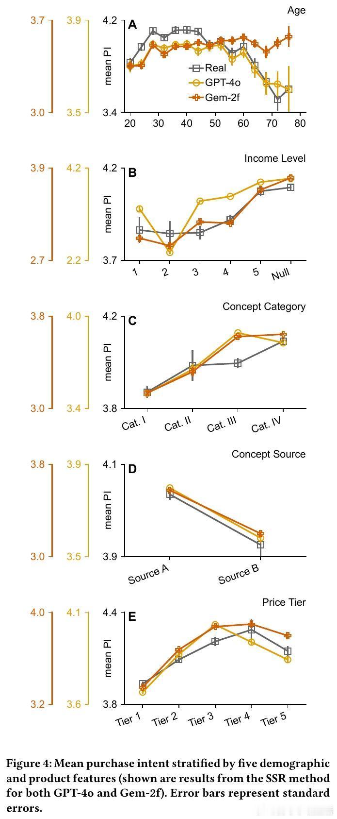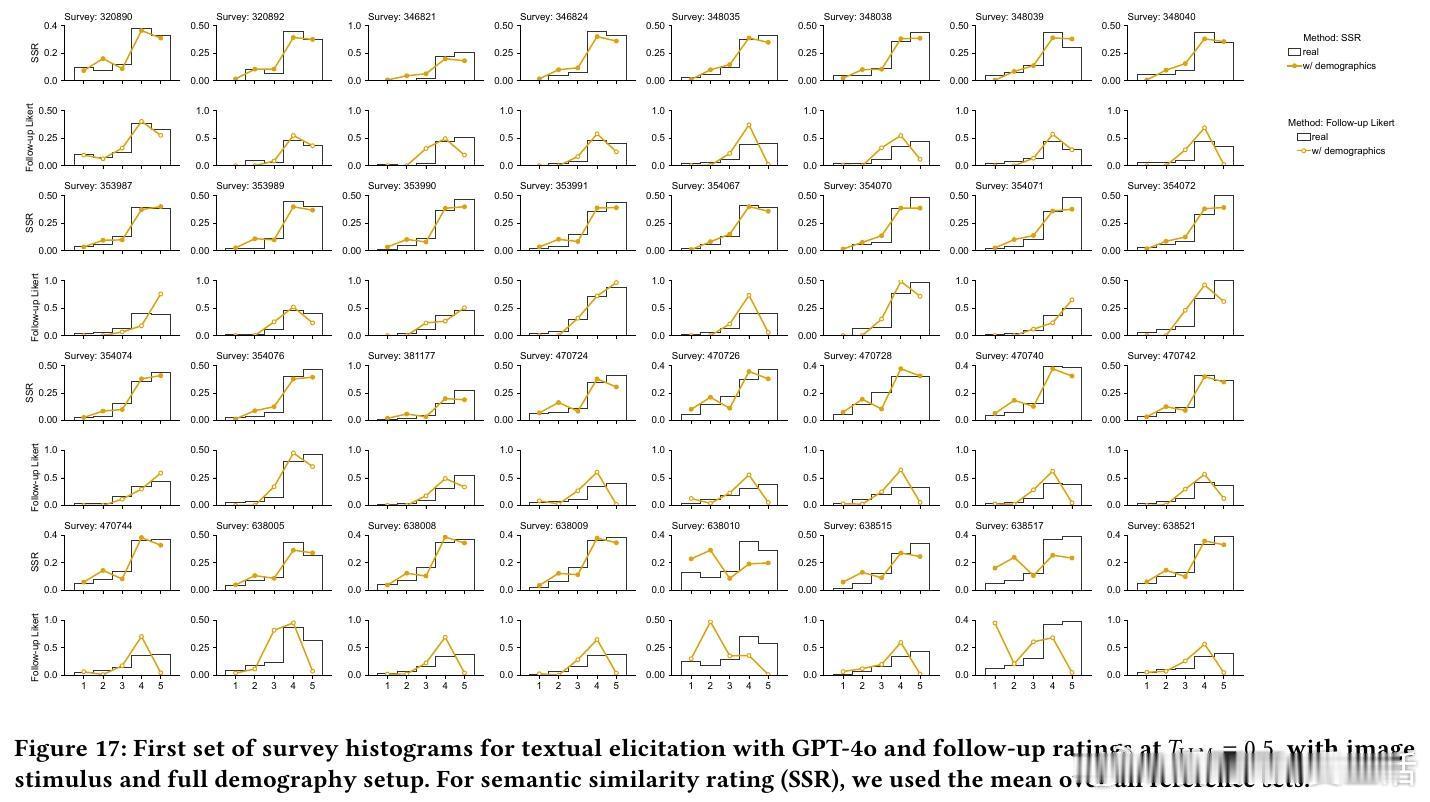 4/ 细节:直接评分模型往往聚焦中间值(3分),缺乏对1分和5分的合理输出,导致分布偏窄;SSR则还原了真实消费者分布的广度和偏态。