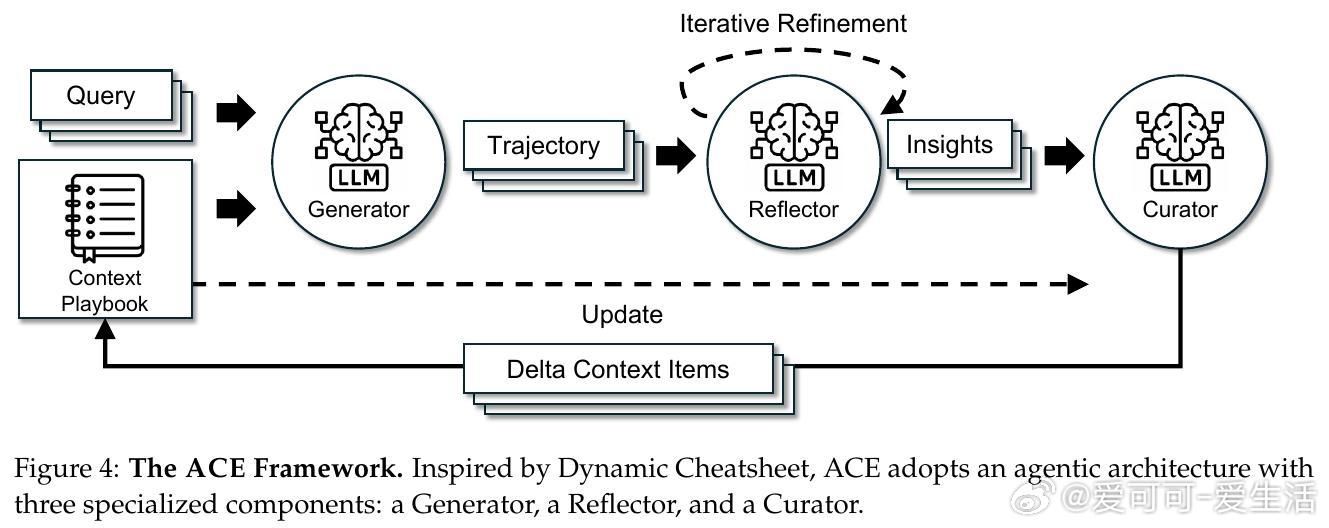 2️⃣ 采用模块化流程:生成器(Generator)产出推理轨迹,反思器(Reflector)提炼成功/失败经验,策划者(Curator)整合成结构化增量更新(delta updates)。