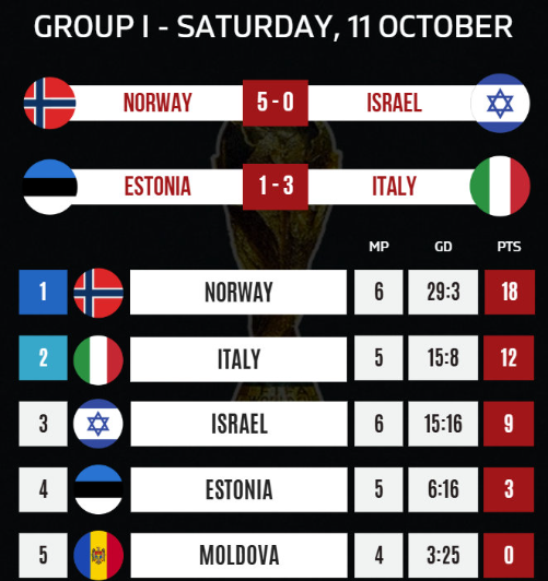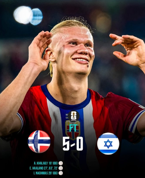 【挪威晋级世界杯已成定局】挪威5比0以色列,小组赛6战全胜,积分榜领跑。哈兰德领军的球队,只要在下一场世预赛(11月14日,主场对阵爱沙尼亚)赢球,就基本锁定2026世界杯的参赛名额,因为他们目前拥有19个净胜球的优势,远远抛离同组的意大利。就算意大利在最后3场世预赛全胜,追到与挪威同分,也很难在净胜球上面与挪威竞争。