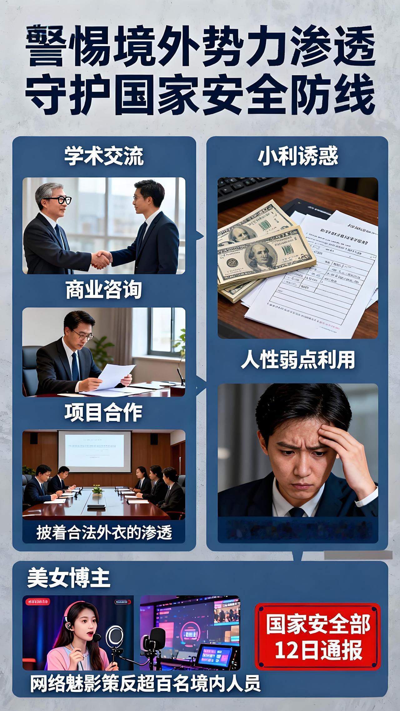 在当今全球化浪潮下,暗流涌动之中隐藏着不为人知的危险。境外某些势力如幽灵般悄然潜入我们的生活空间,他们披着友好合作的外衣——或是学术交流的名义,或是商业咨询的面具,甚至是看似无害的项目合作机会。然而在这糖衣包裹之下,却是精心策划的阴谋:利用人性弱点,用蝇头小利作为诱饵,企图撬开守护祖国机密的大门。每一个看似不经意的举动都可能成为撕裂国家安全防线的第一道裂缝。就在这样一个充满警惕的时刻,国家安全部于12日揭开了一幕令人震惊的现实剧幕:“美女博主”化身为网络世界的魅影,成功诱导并策反了我国境内超过百名无辜者。这一消息如同警钟长鸣,提醒着我们每个人肩负的责任与使命。提防国外渗透 全球化矛盾 中国全球化角色 全球化局势 国际安全困局 全球化浪潮 全球化骗局 国际安全新动向海外洞察 全球化裂缝 全球化竞争 跨国文化暗流 全球化计划 全球化智囊 全球化能力