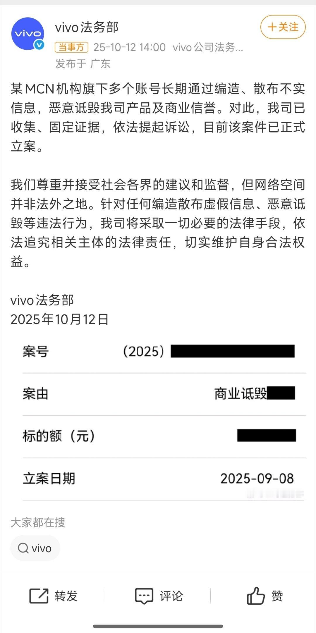 vivo起诉某MCN诋毁索赔近千万
