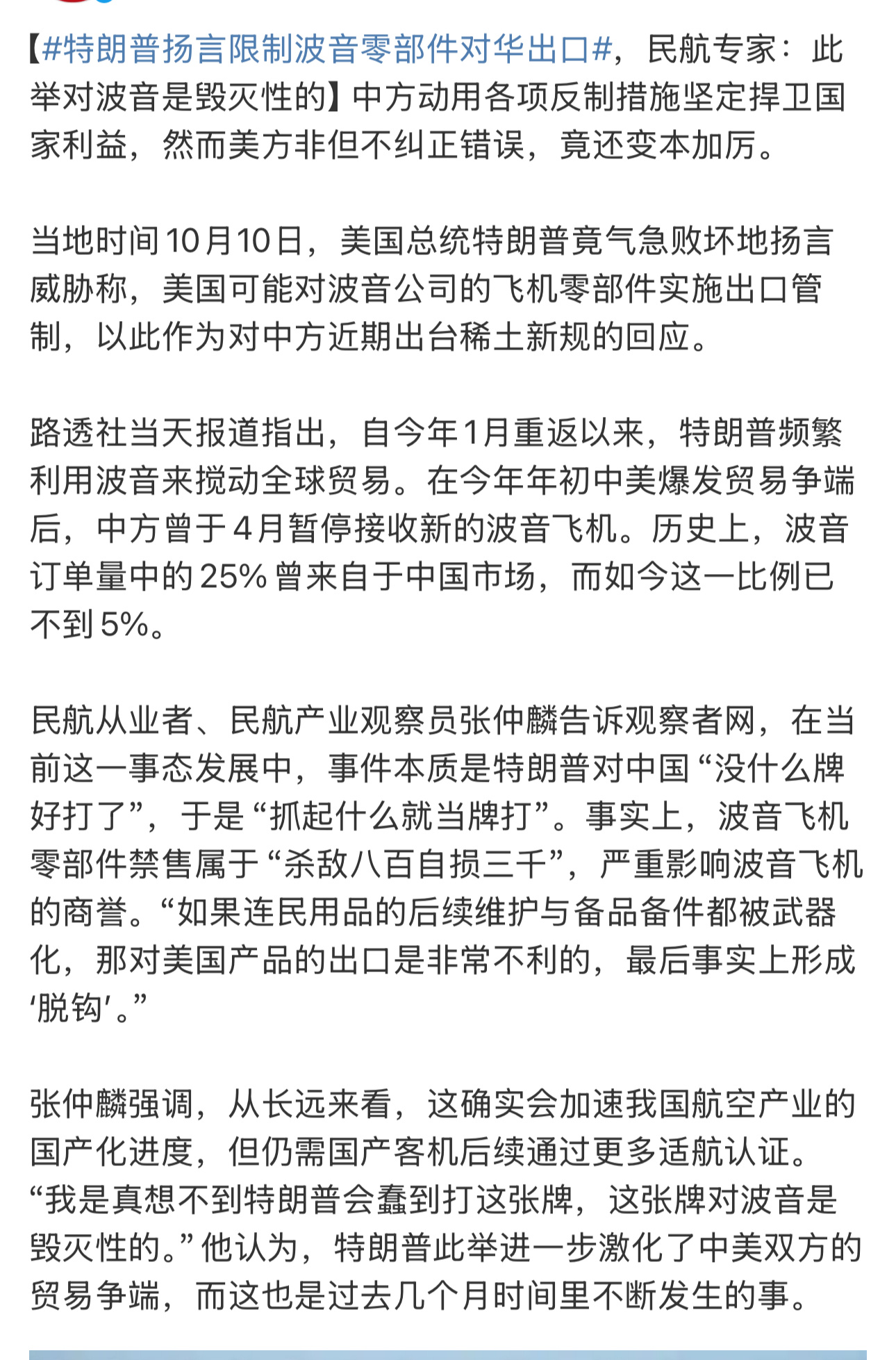 我倒是觉得,国内航空公司的波音飞机越少越好,也利好我们的飞机产业,而且,脱钩应该是不可避免的会发生了,早晚的事。