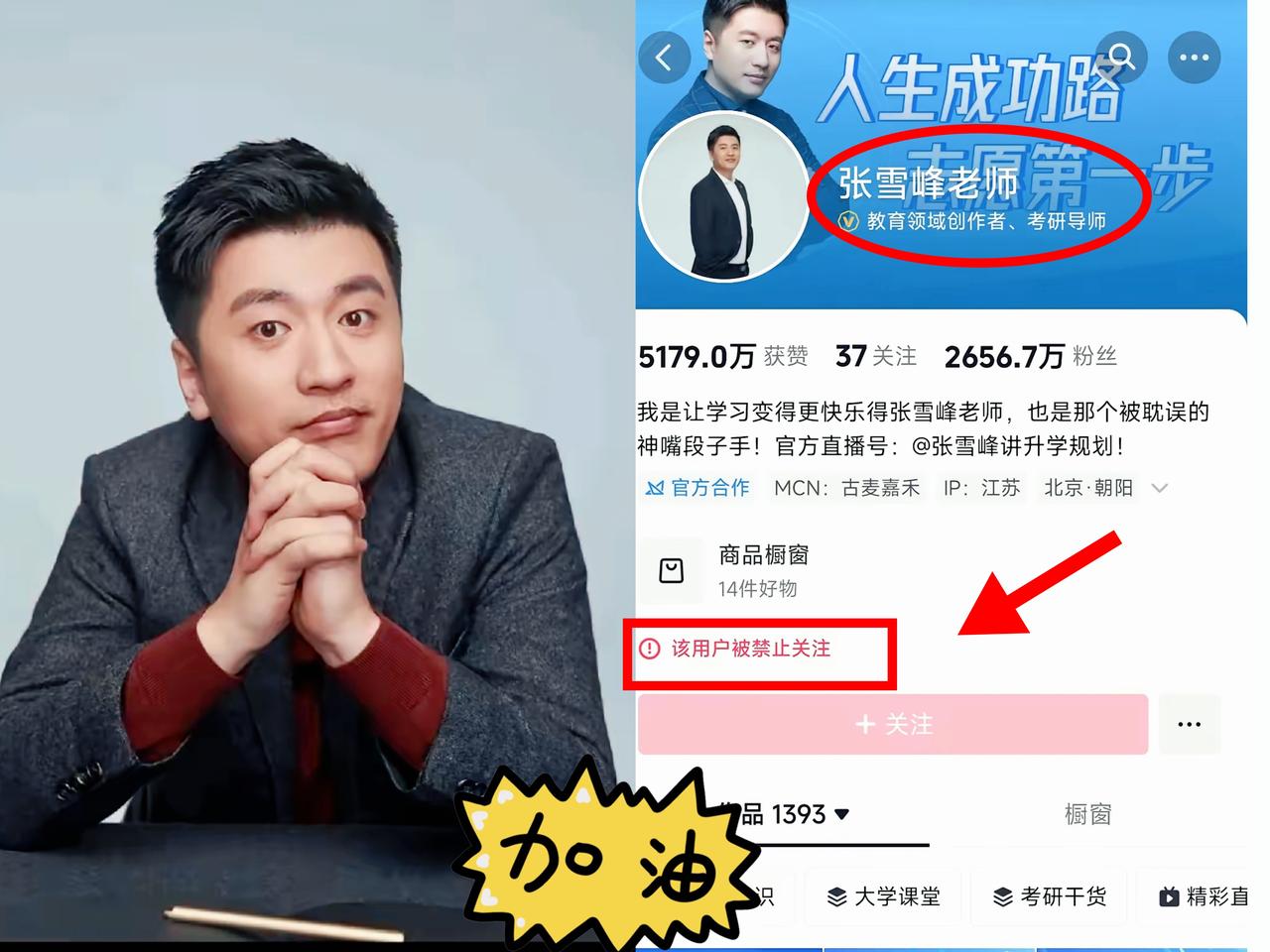 网上一直传张雪峰被封了,今天特意去瞅了眼——账号没封,但显示‘被禁止关注’,直播