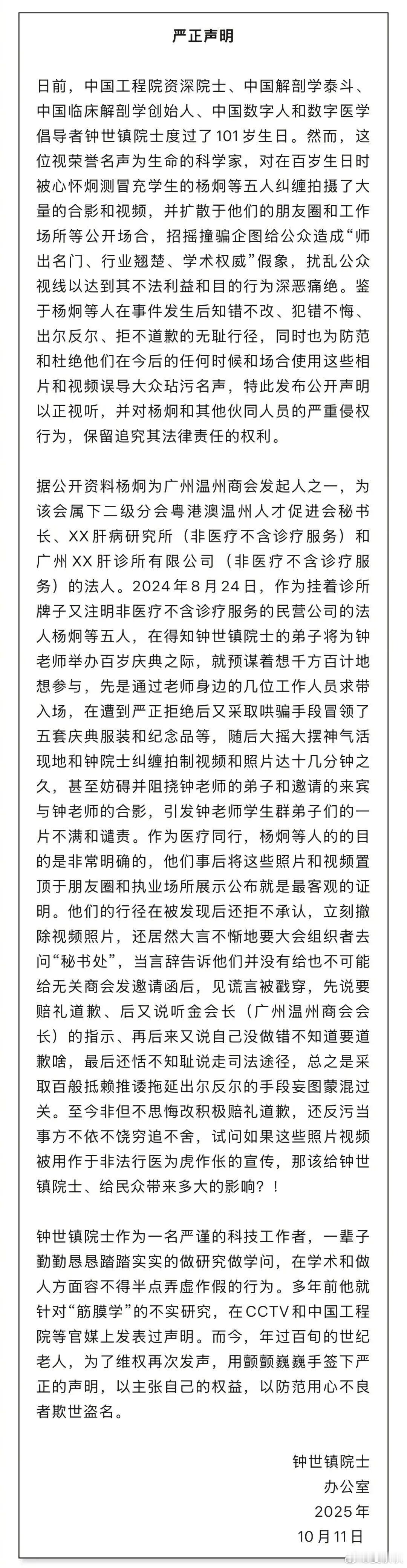 老爷子在声明里,说得明明白白:去年8月24日寿宴当天,有5个人先是死缠烂打要混进会场,被严词拒绝后竟敢冒领五套庆典服装,纠缠院士拍了十几分钟视频照片,把真正的学生和贵宾都挤到一边。这哪是来祝寿的?分明是来抢镜头的。