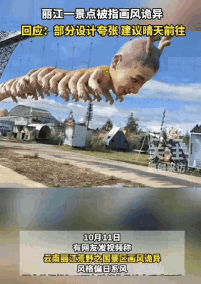 这画风太诡异了! 云南,游客去荒野之国景区玩,结果,刚进去就被吓了一跳,里面的建筑不仅有人体蜈蚣,而且还有三面女孩等作品,画风诡异,风格偏日系风,让人观感不适,如果是阴雨天去,感觉是进入了一个恐怖小镇,太瘆人了! 有网友评论: 别把孩子吓着了,别在那种地方发钱买恶心。估计去过的人,心里都有阴影了,还是不要花钱找罪受了,有那个钱不如带孩子去有意义的地方。 这种地方别去,鬼气森森的。不值得去,没什么好看的,省的吓着自己和孩子。 这种无脑设计[捂脸]也不知道是谁设计的,在中国的地盘上设计这些玩意儿,不知道咋想的? 对此,大家怎么看?