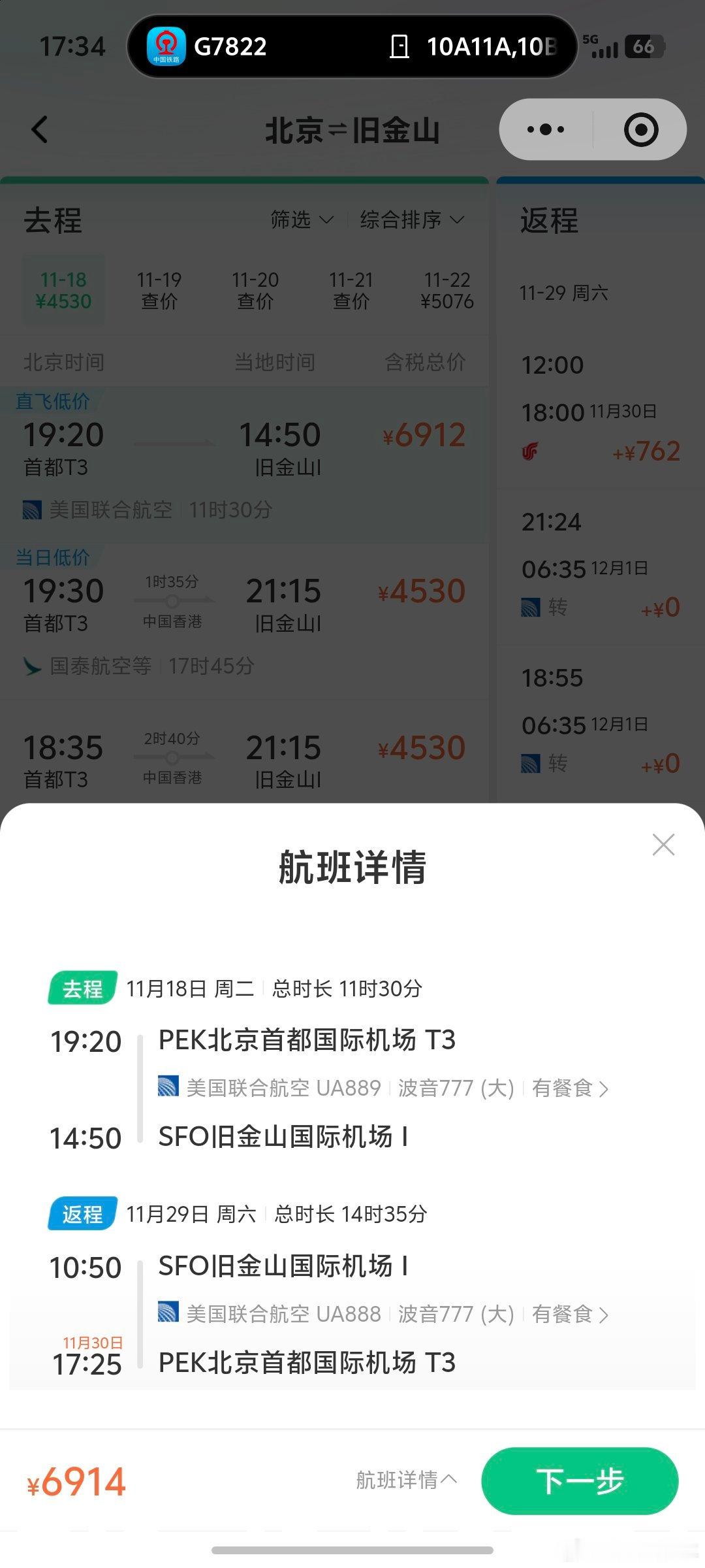 9月底我查11月北京-旧金山往返机票,一开始6900多,过两天变7000出头,临近国庆结束直接涨到7300+(图一)。以前不咋比价的我,就试着去别的平台搜了下,万一有更便宜的呢。