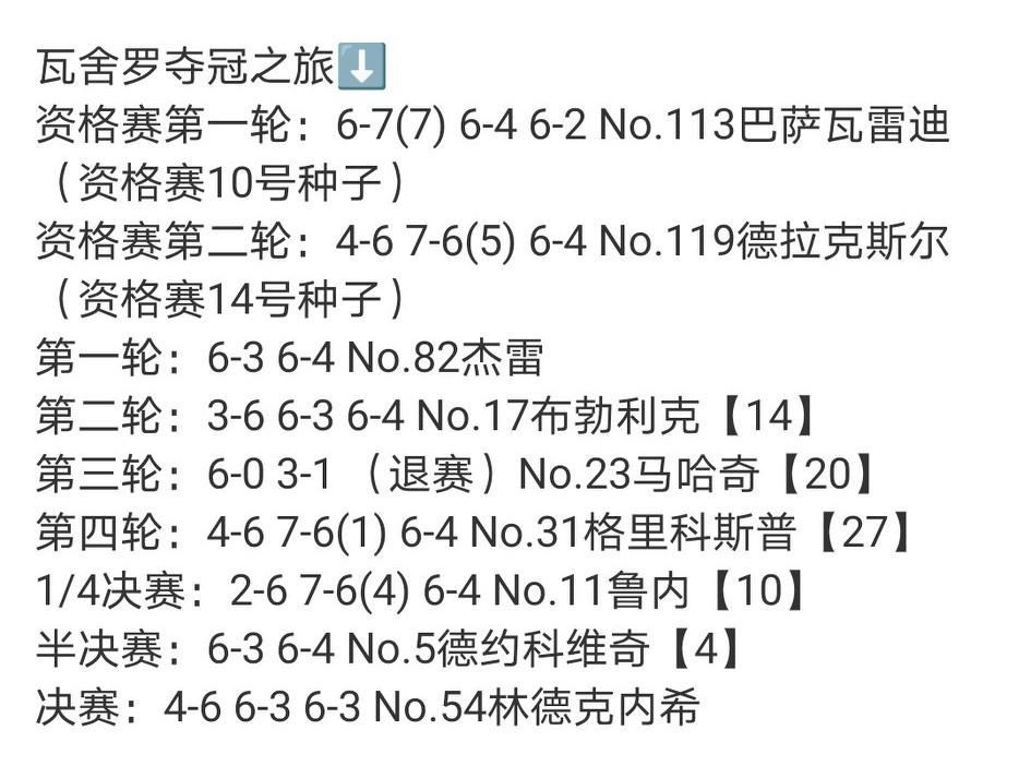 一个在巡回赛从未两连胜的200大球员今年创造了网球神话。 在上海大师赛开始前六周,瓦舍罗给一位朋友发了这样一条消息:“我要去参加上海大师赛资格赛,碰碰运气,因为我随时都可能遇到超神的表现。” 他真的在上海夺冠了! 赛后他写道:“姥姥和姥爷会感到自豪的。”