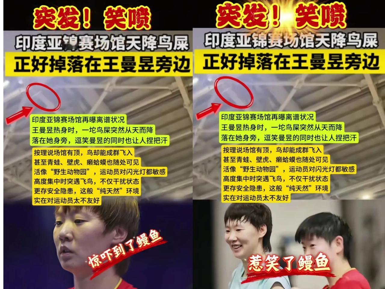 突发! 王曼昱在印度场馆热身时, 馆内突然 头顶竟掉下不明物,抬头一瞧,竟是鸟屎!她都忍不住笑了,估计当时练球都不敢张嘴! 这看似纯天然生态,对运动员却太不友好。体育赛事场馆,追求生态没错,但得先保障运动员正常发挥。这事儿处理不好,可能影响比赛成绩,也给运动员留下心理阴影! 场馆有屋顶,鸟咋还成群飞进来? 说真的,印度亚锦赛这场馆,简直像个野生动物园:小鸟成群飞,青蛙、壁虎、癞蛤蟆也随处可见! 大家说,场馆该咋平衡生态和赛事需求呢?