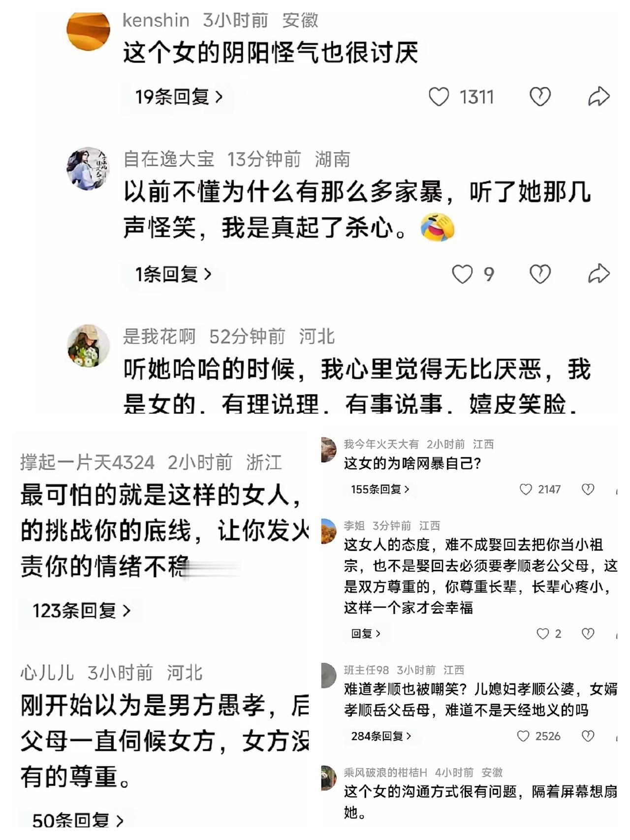 江苏女子发视频网暴丈夫反被骂? 见过离谱的, 没见过这么搬起石头砸自己脚的! 江苏一女的拍丈夫怼脸视频想网暴人家,说丈夫娶她是为了孝顺岳父母,还逼她退彩礼、让孩子改母姓,可视频里她那笑声听得人浑身难受,一边笑还一边鼓掌,明摆着故意激怒丈夫。 结果呢?丈夫全程没发火,还好好跟她讲道理,说孝敬父母本来就该,而且男的结婚后一直对她和她家人很好,反倒是她把男方父母当佣人,男的多说两句就阴阳怪气。 她以为发了视频就能让网友骂丈夫,可大家眼睛又不瞎,评论全一边倒说她有问题——不是谁先拍视频谁就占理,装可怜也得看事实站不站你这边。 想靠网暴拿捏别人,先掂量掂量自己做的事对不对,耍小聪明最后只会让自己难堪。 你们要是刷到这种视频,会先看完整件事的来龙去脉,还是直接跟着骂?