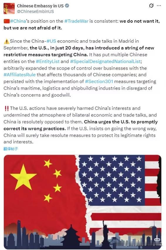 中国驻美大使馆:中方在贸易战问题上的立场是一贯的,我们不想打,但也不怕打。自9月中美马德里经贸谈判以来,美国在短短20天内就推出了一系列针对中国的新限制措施。美方的做法严重损害了中方利益,破坏了双边经贸谈判的气氛,中方对此坚决反对。中方敦促美方立即纠正错误做法。如果美方一意孤行,中方必将采取坚决措施维护自身正当权中美贸易关系 中美贸易新政 中美经济贸易 中美贸易战略