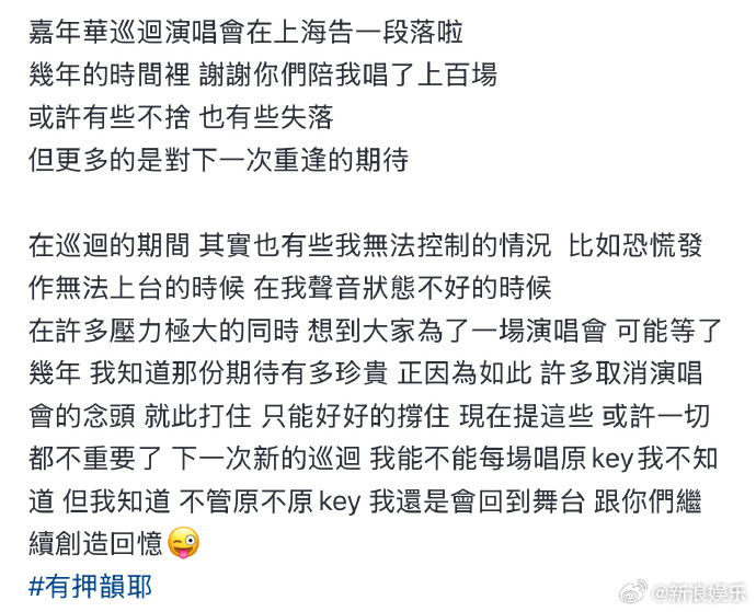 周杰伦演唱会期间恐慌发作周杰伦 不管原不原key我都会回舞台 12日,周杰伦发文告别嘉年华巡演,透露期间也会有无法控制的情况,比如恐慌发作无法上台,也会声音状态不好、压力大。他还称:“我能不能每场唱原key我不知道,但我知道,不管原不原key,我还是会回到舞台,跟你们继续创造回忆。” 一分钟视频创作季(素材源自网络谨慎辨别)