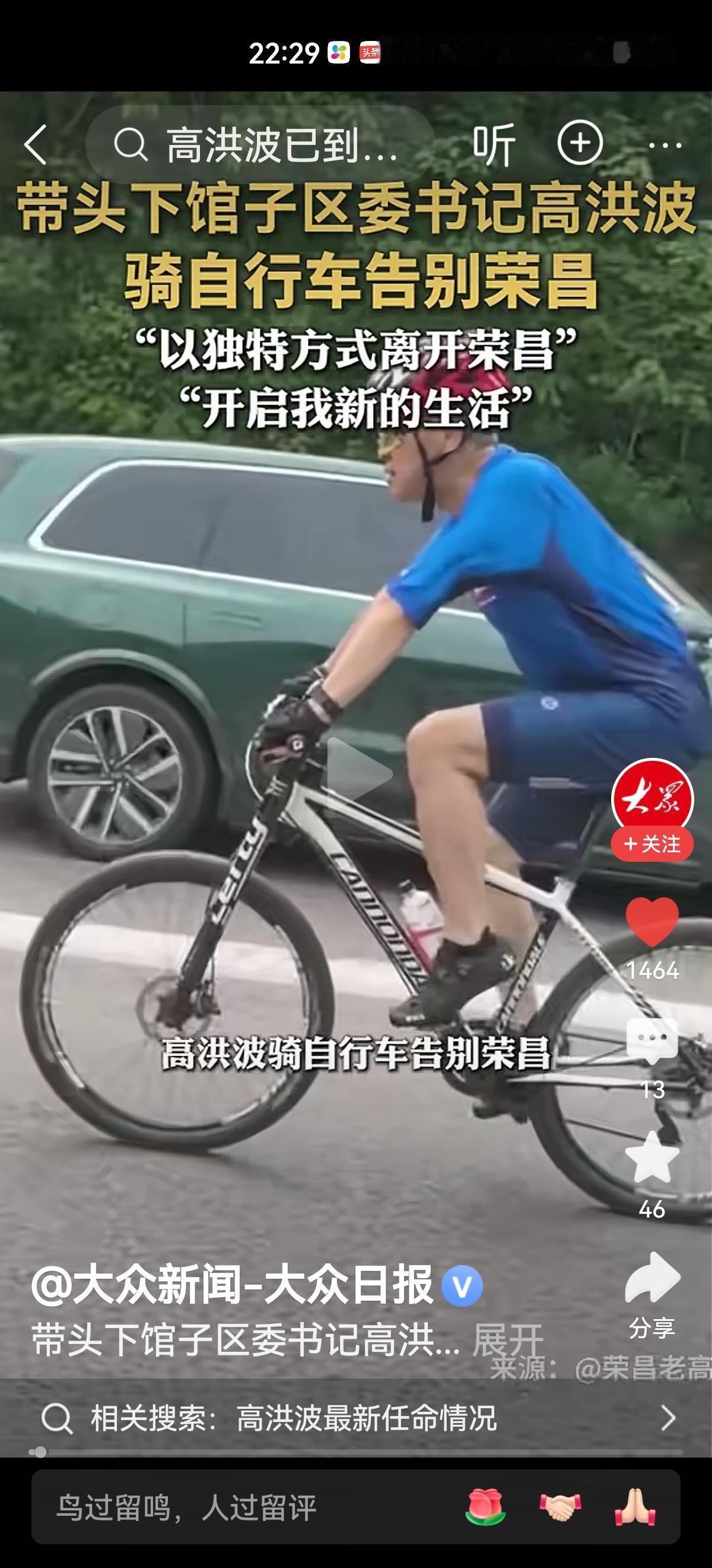 带头下馆子的荣昌区委书记高洪波,以这种独特的方式告别荣昌,走上新的工作岗位。今年,高洪波已满60周岁,已经接近退休年龄的他有着强健的体魄。他在视频中说,历时5小时,从荣昌人民广场出发,到达江北石子山体育公园,完成了一次100多公里的骑行。从今天开始转换赛道,健康为上,每天开始游泳、骑车、跑步。高书记的心态真好,做官、做人、做事都带有一股蓬勃的朝气,满满的正能量。据媒体报道,高洪波已到重庆市政协任职。祝高书记工作顺利!重庆荣昌书记
