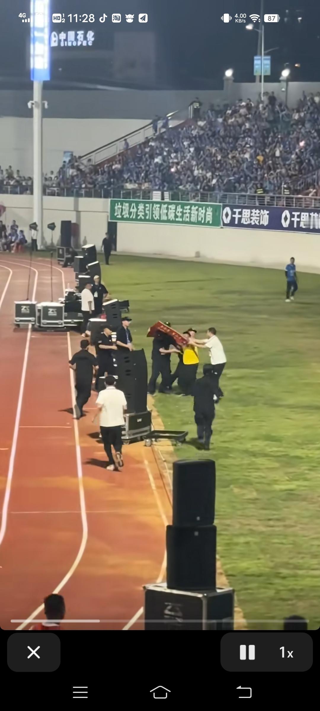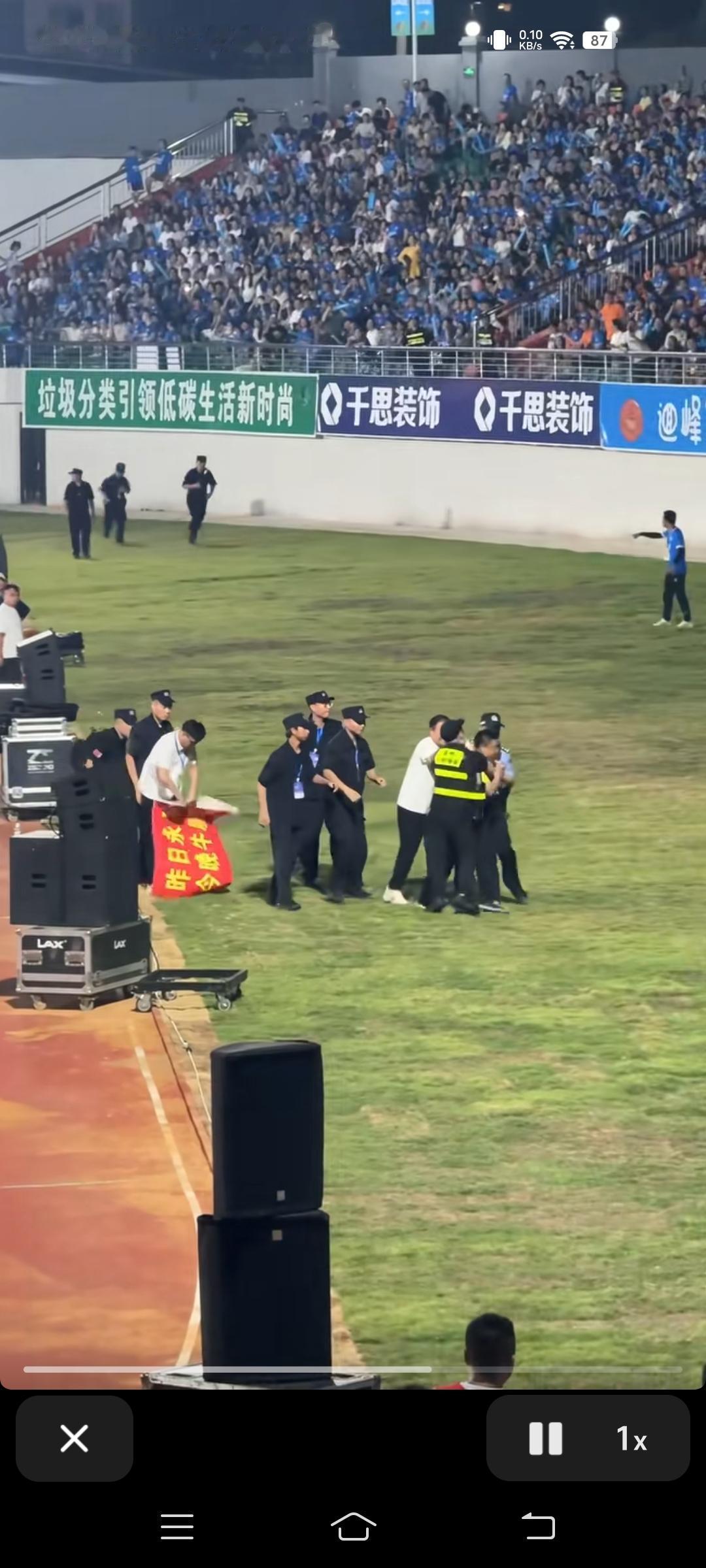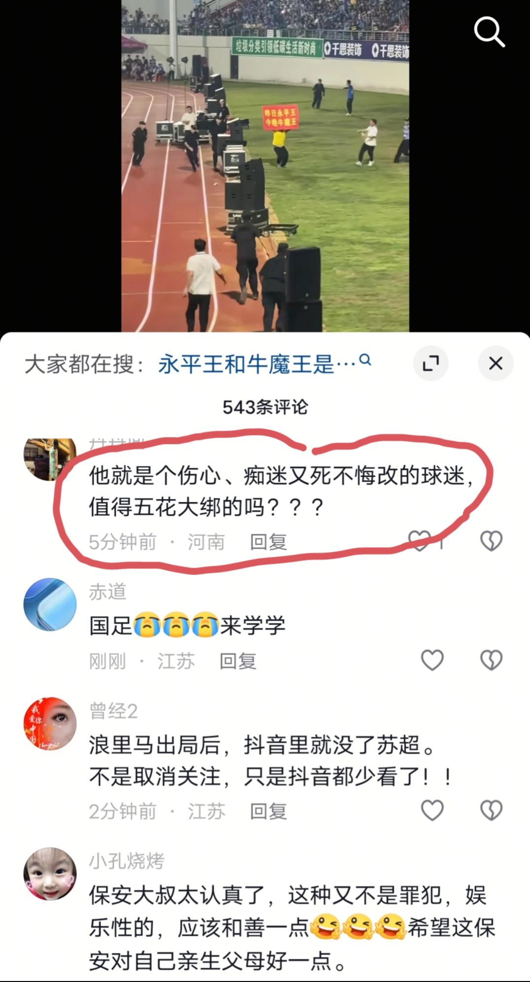 湘超上搞笑的一幕: 这事情发生在永州和邵阳的比赛当中,一狂热的永州球迷手举“昨日永平王,今日牛魔王”的牌子在场内狂奔,面对这场内突发事件,多名安保人员也是立即上去将他制服…… 有网友透露:这位球迷可能因为这场球要送出去六头牛。所以他到底是兴奋激动呢,还是永州进球了不开心呢? 评论区网友却是觉得安保人员大可不必这样,他们表示: 他就是个伤心、痴迷又死不悔改的球迷,值得五花大绑的吗? 应该学学人家nba的工作人员,笑眯眯的把狂热球迷请出去。 各位看官,你们怎么看?