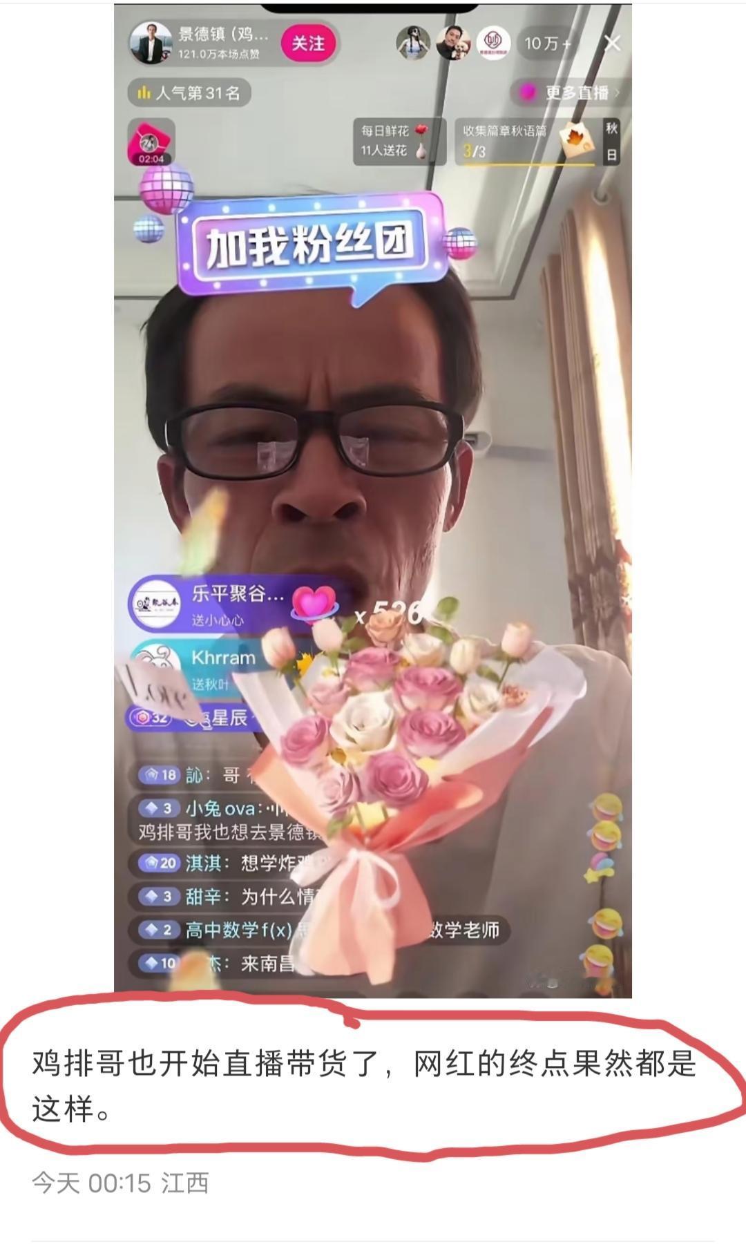 江西网友酸溜溜的发文称:鸡排哥也开始直播带货了,网红的终点果然都是这样…… 评论