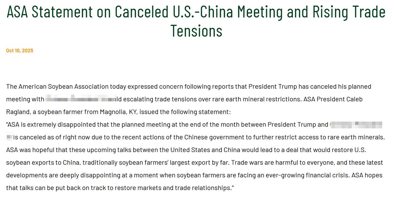 很多人可能想不到,特朗普因为稀土而威胁征税(现在语气又放缓了),最急眼的是美国大豆种植户。 这两天,人在蒙古的美国大豆协会主席拉格兰,听说特朗普要取消与中国的减免,立刻发出了一份声明。 就是下面张图。 声明的开头就是“极度失望”(extremely disappointed)。 原因很简单,美国豆农今秋收获的新豆,现在只剩下最后一个希望,就是谈判不破裂,中国恢复下订单。 特朗普如果不谈,那就彻底没戏了。 美国豆农现在正在全球各地推销,包括到越南、孟加拉以及非洲的一些国家,推销大豆。 拉格兰人在蒙古,不太可能是找稀土,大概率也是在卖大豆。 即便这样,也完全弥补不了他们在中国市场的损失。 拉格兰在声明中呼吁,尽快谈判,尽快恢复贸易,让美国大豆重新回到中国市场。因为豆农正面临巨大的财务危机。