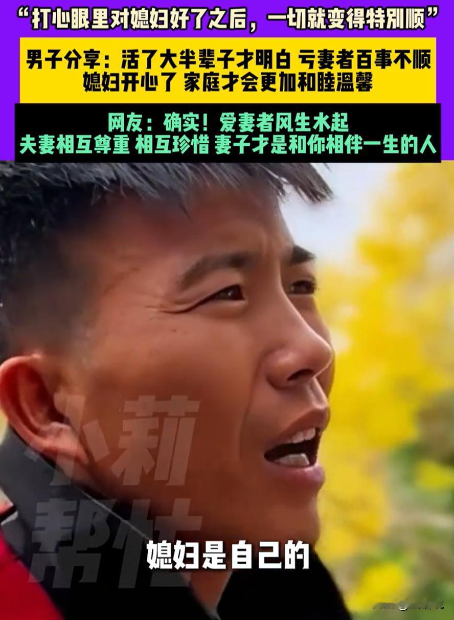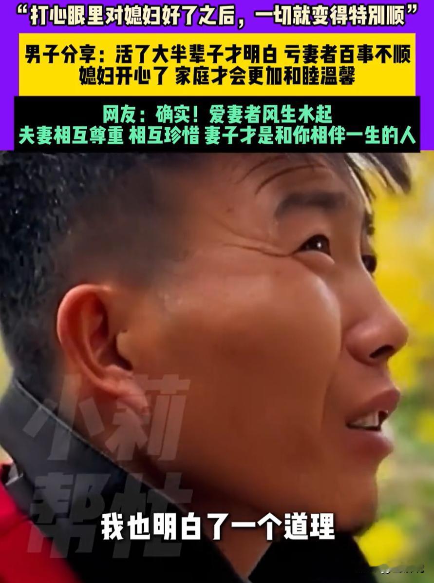 “活通透了!”宁夏,一男子发视频说,生活中最重要的一点就是对媳妇好一点,只要媳妇开心了,诸事百顺,反过来,亏妻者百事不顺!网友:请推给我老公看! 可以说,这段视频,既是男子的感悟,也是他对外人的一段提醒,他表示:现在很少会惹媳妇生气,而这是他从以往的经验中总结出来的 他发现,以前只要和媳妇吵完架,一出去办事就没有一次顺当的,自打明白了这个道理,打心眼里对着媳妇好了之后,就发现一切事情都变得顺利起来,现在无论是外人朋友,哪怕是父母,谁都不能说自己的媳妇不行。因为媳妇开心了,他才会更加开心 对此,有网友赞同说道:我身边都是做生意的,能做的好的基本对老婆都很好,对家人都不好的人也没人敢和他做生意打交道打心里瞧不起,看一个人品怎么样首先看他对家人的态度,对家人都不好可能对别人好吗? 细想一下确实如此,一个家能不能温馨和睦,往往看女人脸上的笑容。她若舒展,全家都暖;她若委屈,谁心里都不踏实。这不是说女人决定一切,而是说两个人的关系质量,决定了生活的质量 有人总觉得在外打拼才是大事,家里的小情绪不必在意。可现实中,多少人的不顺,都是从家里带出来的烦恼?心里憋着气,脸上挂着霜,做事没耐心,说话带刺——这样的状态,怎么可能顺利? 有些人觉得“怕老婆”丢面子,其实那不是怕,是懂得珍惜。一个男人能对外人笑脸相迎,却对自己媳妇甩脸色,那才真是没格局