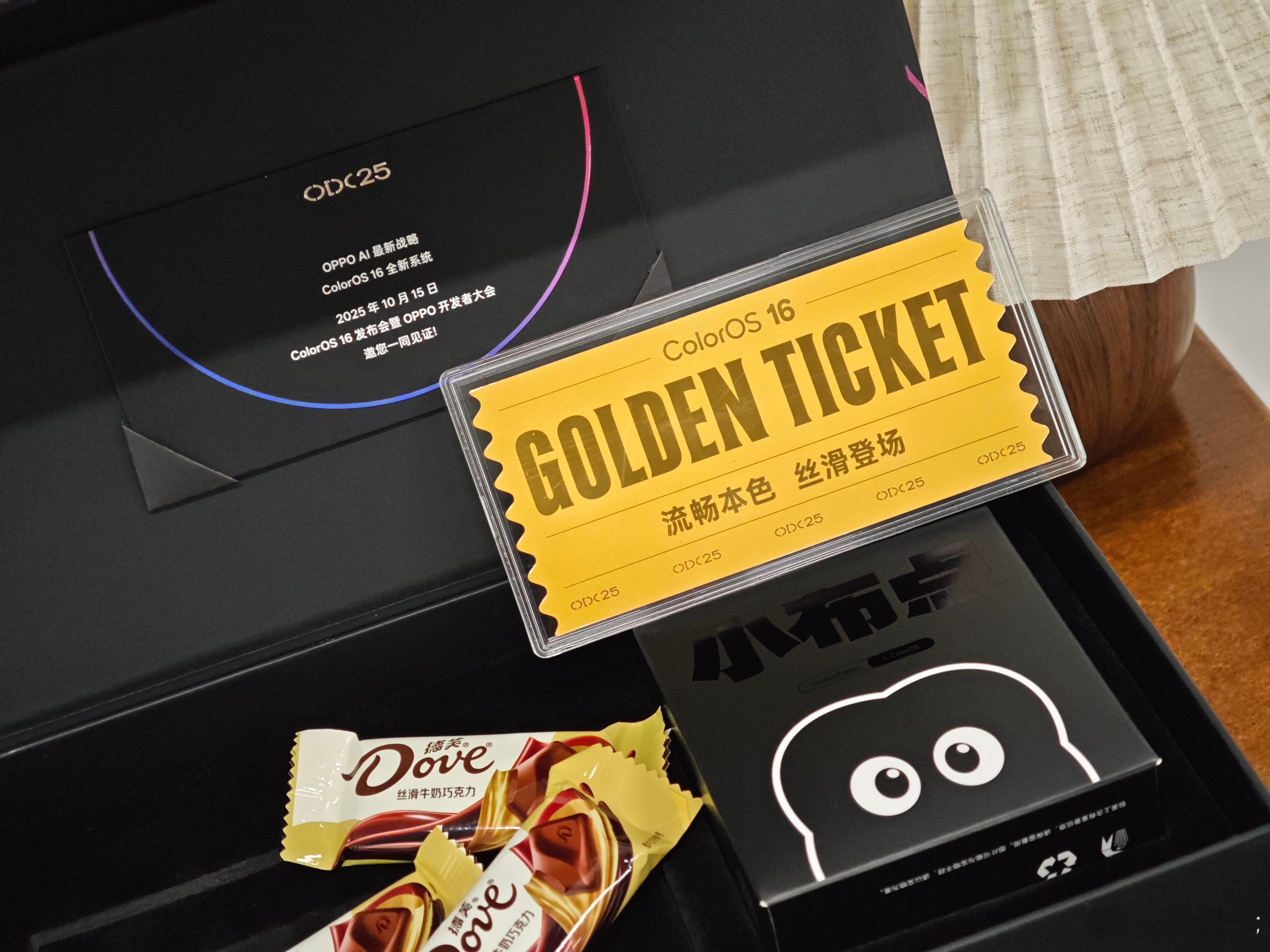 OPPO开发者大会邀请函:《查理和巧克力工厂》同款巧克力金票、德芙巧克力、全新IP小布点毛绒玩偶
