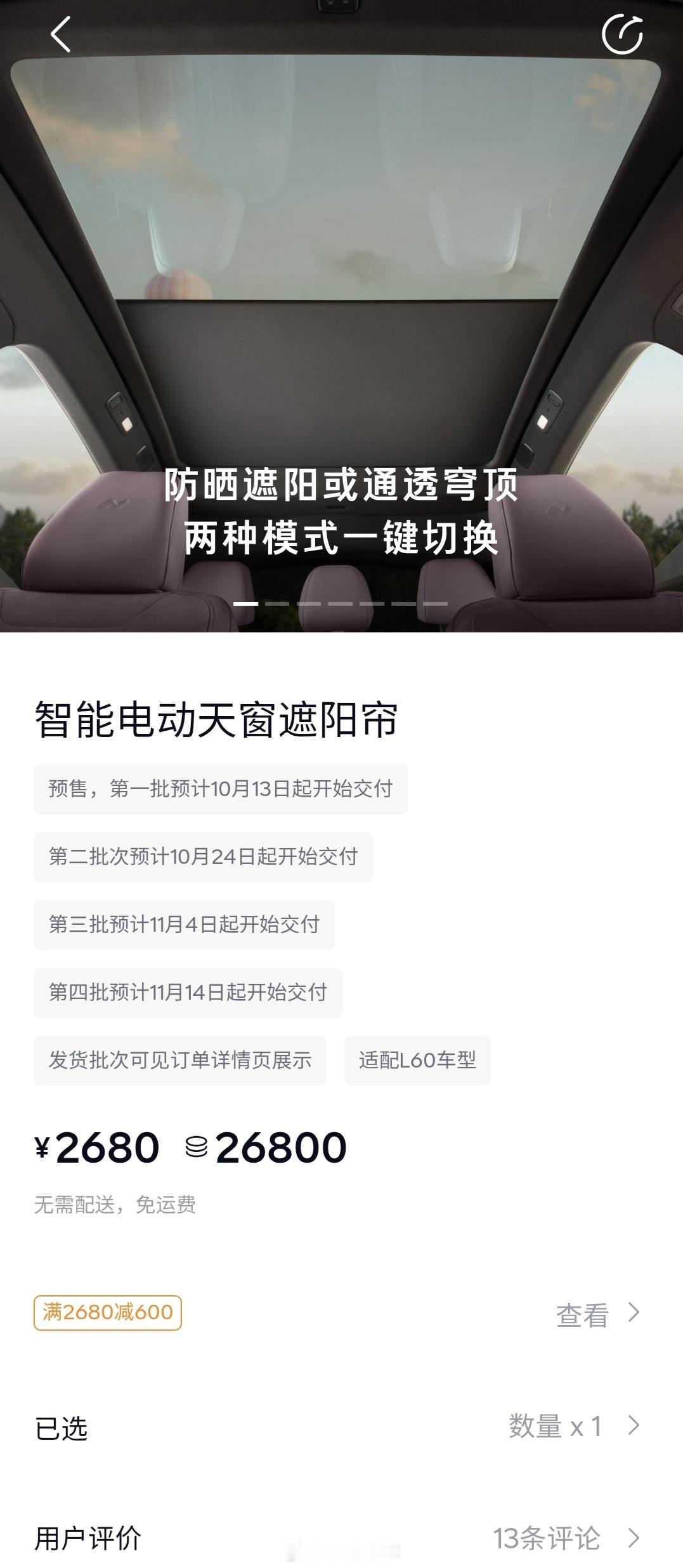 最近乐道官方商城上线了电动遮阳帘,官方售价2,680,限时优惠价2,080。