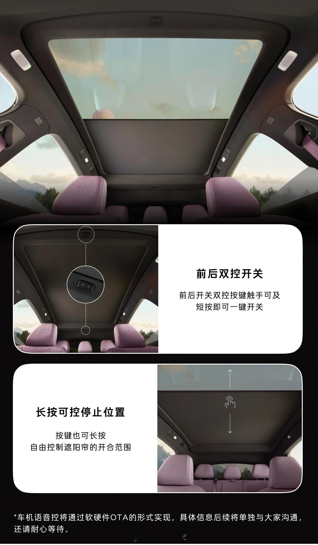 遮阳帘隐线安装,带了智能防夹功能,前后排都有控制它的按钮,语音控制要等后续 OTA。