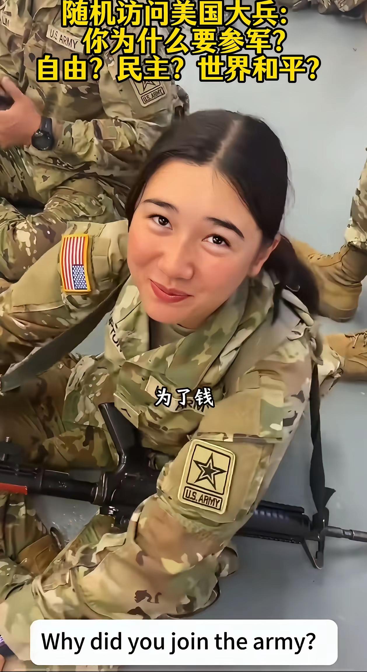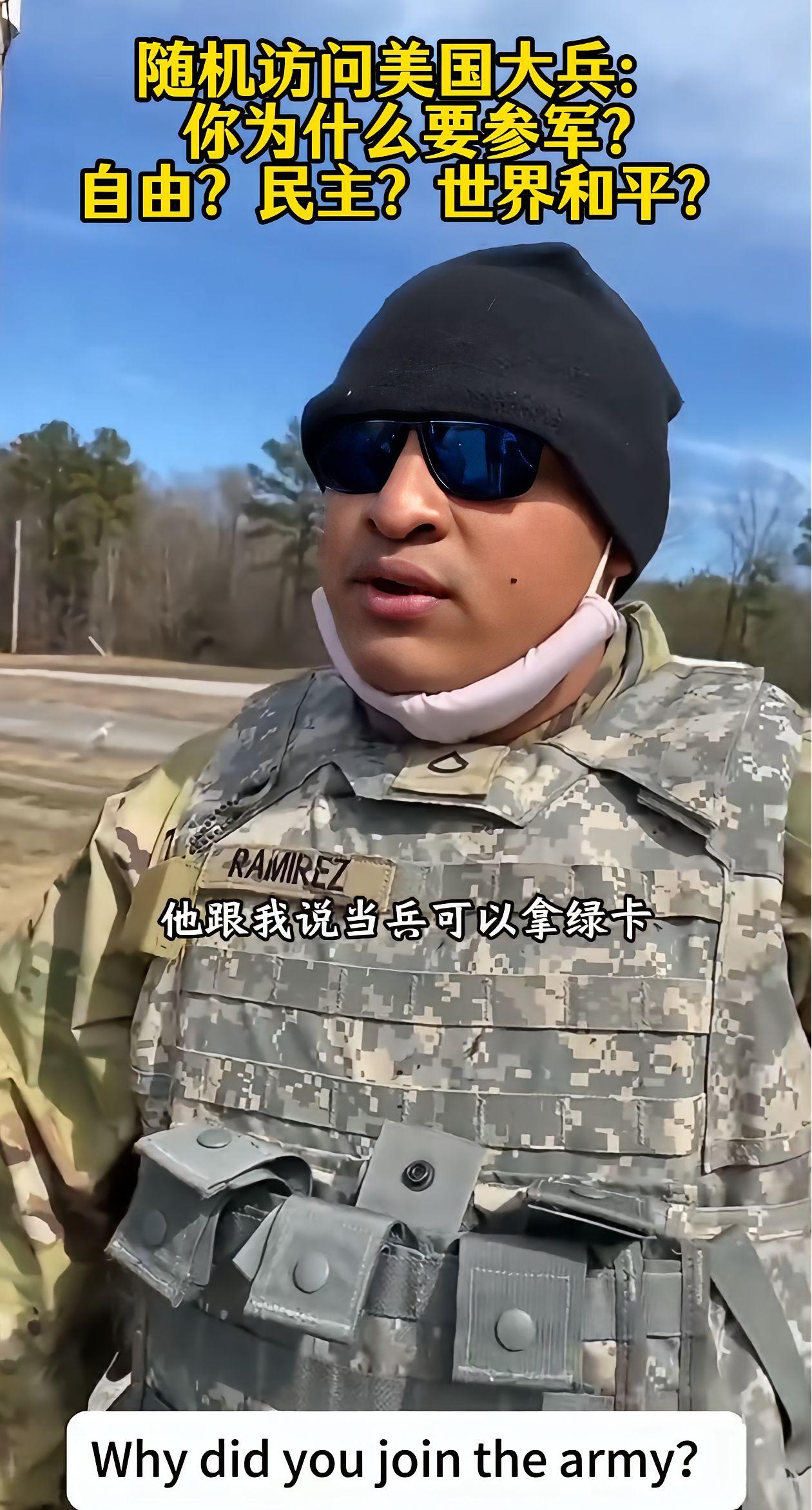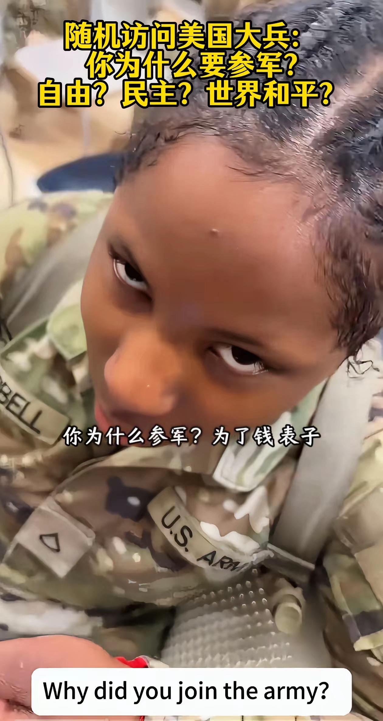 美国大兵钢铁般的意志,都在这次采访里了。在被问到为什么参军,美国大兵的回答无外乎几种。 第一,为了拿到绿卡,这绿卡竟然成为了交换的筹码。第二,就是为了结交异性,这个问题,有点复杂,当大兵能结交异性发展恋情?没听说过。第三,就是可以在战场上合法杀人。这种人心理多少有点毛病。第四,也就是绝大多数的愿望,可以拿到钱。 根据网上信息,美国低等兵每个月可以拿两千多美元的薪水,另外一种比较高的军官可能能拿到的就差不多是低等士兵的十倍了。在开看看,他们钢铁般的意志,你觉得还刚吗?看看咱们网友作诗总结的到位不到位: 美军不怕远征难,万水千山只等钱。 牛奶可乐腾细浪,牛排罐头走鱼丸。 咖啡喝的周身暖,火鸡吃到五更寒。 更喜钞票送到手,美军看后笑开颜。