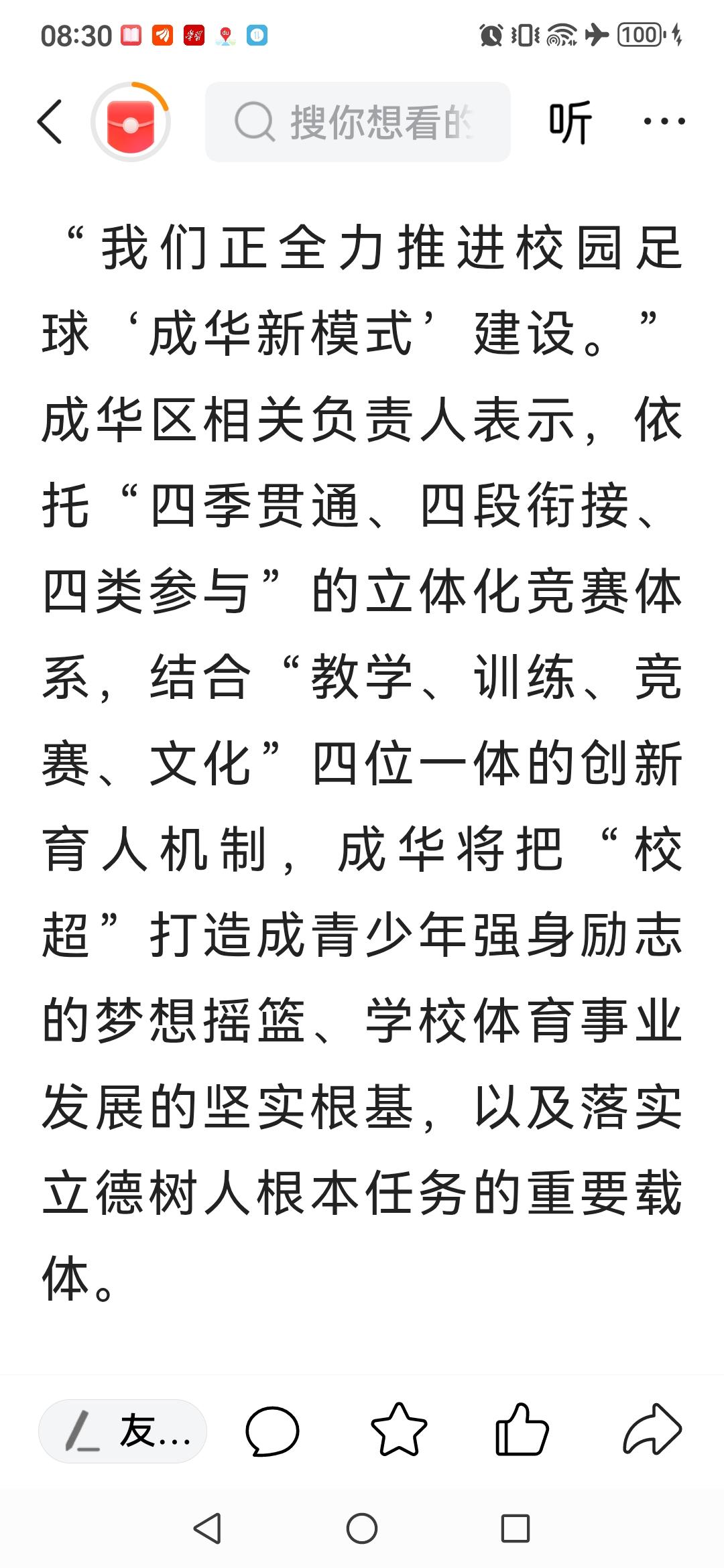 别看国足很菜,举国体制一起、民间足球一来,中国足球定有未来。 当下村超、市超、省超、职超风起云涌,成都市成华区19所中学校园超级联赛又开赛,四季贯通、四段衔接、四类参与”与教学、训练、竞赛、文化深度融合,搭建了从娃娃抓起的校园足球大舞台。相信成华起了头,锦江、武侯、青羊、金牛都会跟,全省全国都会接着来。 只是民间足球都统称“超级”这起点有点高,希望各主办方多接地气,千万别把职业足球的毛病引到民间足球来。