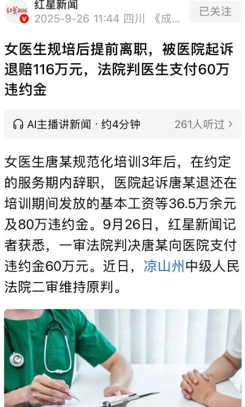 “现代版东郭先生和狼!”四川凉山,一女医生被医院送去深造3年,双方有言在先,女医生结束学业后必须在医院工作8年,这3年,医院会给女医生发放36.5万多元工资,如果女医生跳槽,不但要退还工资,还要赔偿80万,可万万没想到,女医生深造结束第7天就辞职另谋高就,医院愤怒的把女医生告上法庭,案子经过2审,法院最终的判决出乎意料。 三年前,唐某还是医院重点培养的青年骨干医生,年仅32岁,却已经在妇产科积累了丰富的临床经验。 那时,医院为提升整体医疗水平,决定派出几名骨干医生到成都一所三甲医院进修学习,所有费用由医院承担。 医院领导找唐某谈话时,语气诚恳而郑重:“这次学习机会难得,医院会全力支持你。但我们有个前提——你回来后必须为医院工作满八年。” 唐某当时思索片刻,还是点了头。她出身凉山农村,能有稳定的编制工作已属不易,这次深造更是难得的机遇。 协议签订得清清楚楚:医院承担三年期间的工资及培训补贴共36.5万元;唐某须履行返岗服务期八年。 如提前离职,不仅需退还全部培训期间工资,还需赔偿违约金80万元。双方签字、盖章,合同正式生效。 三年的深造期里,唐某确实得到了快速的成长。她跟随省医院的专家学习最前沿的产科技术,还参与了高危妊娠病例的抢救。 她常常加班到深夜,笔记本上密密麻麻写满了手术体会和病理分析。她甚至被导师夸奖:“你的技术水平,回到县医院,至少是副主任医师的层次。” 随着视野的开阔,唐某的心态也发生了微妙变化。她开始对原本的小县城生活产生了排斥。 成都的生活节奏、医疗环境、科研氛围,都让她深深着迷。相比之下,凉山那边的设备简陋、病种单一、同事保守,让她觉得“回去是浪费青春”。 2024年6月,唐某顺利结业。仅仅过去7天,她便向医院递交了辞职报告。理由简单:个人发展需要。 这封信像一颗炸弹,瞬间在医院内部引爆。院长气得拍桌子:“这不是出尔反尔吗?合同白签了?我们投资她三年,结果刚回来就走人!” 财务科、医务科、院办同时行动,按照合同要求,要求唐某退回36.5万元并支付80万元违约金,总额116.5万元。 唐某接到通知后冷笑一声:“我深造期间是医院发工资没错,但那也是我凭本事获得的,我不是白拿钱!至于80万违约金,那是霸王条款,根本不合法。” 谈判破裂,医院一纸诉状将唐某告上法庭。 在法庭上,医院方态度强硬。他们提交了当初的培训合同、工资发放凭证、以及派出进修的相关公文。 院方律师慷慨陈词:“被告唐某签字画押,是完全自愿的民事行为。医院投入巨额资金,是对她个人能力的培养。 她回来仅一周就辞职,严重损害了医院的利益,也违背了职业操守。我们要求她按照合同履约——退还36.5万元,赔偿80万元。” 唐某的代理律师则从另一角度发力:“原告的培训合同显然存在不公平条款。 首先,医院并未明确唐某深造期间是否属于工作时间;其次,80万元违约金显然远超合理范围。根据《劳动合同法》第25条规定,用人单位不得与劳动者约定高额违约金限制劳动者的择业权。此合同部分属无效条款。” 一审法院经过审理后认为: 唐某确实在合同上签了字,医院支出了实际费用,因此唐某需要退还三年期间医院发放的36.5万元工资。 然而,对于80万元的违约金,法院认为该数额明显过高,违反了公平原则,应予调整。最终,一审判决唐某退回36.5万元,并赔偿医院违约金60万元。 这一结果,唐某方无法接受。她不服判决,继续上诉。 到了二审,四川省高级人民法院的法官在庭上问唐某:“你承认自己签过协议吗?” 唐某点头:“是的。” “那你为什么又要否认义务?” 唐某略显激动:“因为我当时并不懂那些条款的真正含义。我只是个医生,不是律师。合同让我绑在医院八年,不准离职,我觉得那是变相的束缚!” 二审法院最终维持一审判决。 这场持续一年多的官司,以双方“互不满意”的结局落幕。
