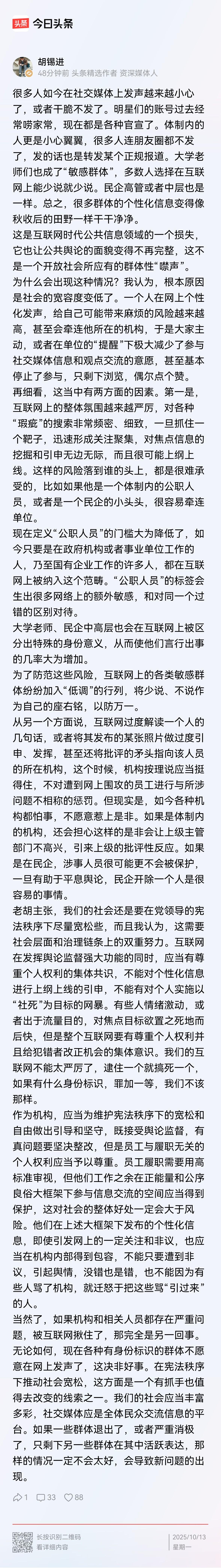 胡锡进同志 欢迎你再回到今日头条 不过 我对你今天发表的言论 不太认同 你把公职人员 大学教师 企业高层 列入“敏感群体” 这个提法不妥当 何为“敏感群体” 你说 这些“敏感群体” 纷纷加入“低调”行列 将少说不说作为座右铭 你说的这些 有点以偏概全 你说 互联网应当 尊重个人权利 不能对个性化信息 进行上纲上线 胡锡进这点看错了 对那些上纲上线的 不仅仅是个性化信息吧 你说 互联网要给 犯错误者改正的机会 互联网不能太严厉了 胡锡进你又说错了 互联网还是严厉一点好 要不然 会乱套的 中国网信办 不断采取整治措施 就是明证