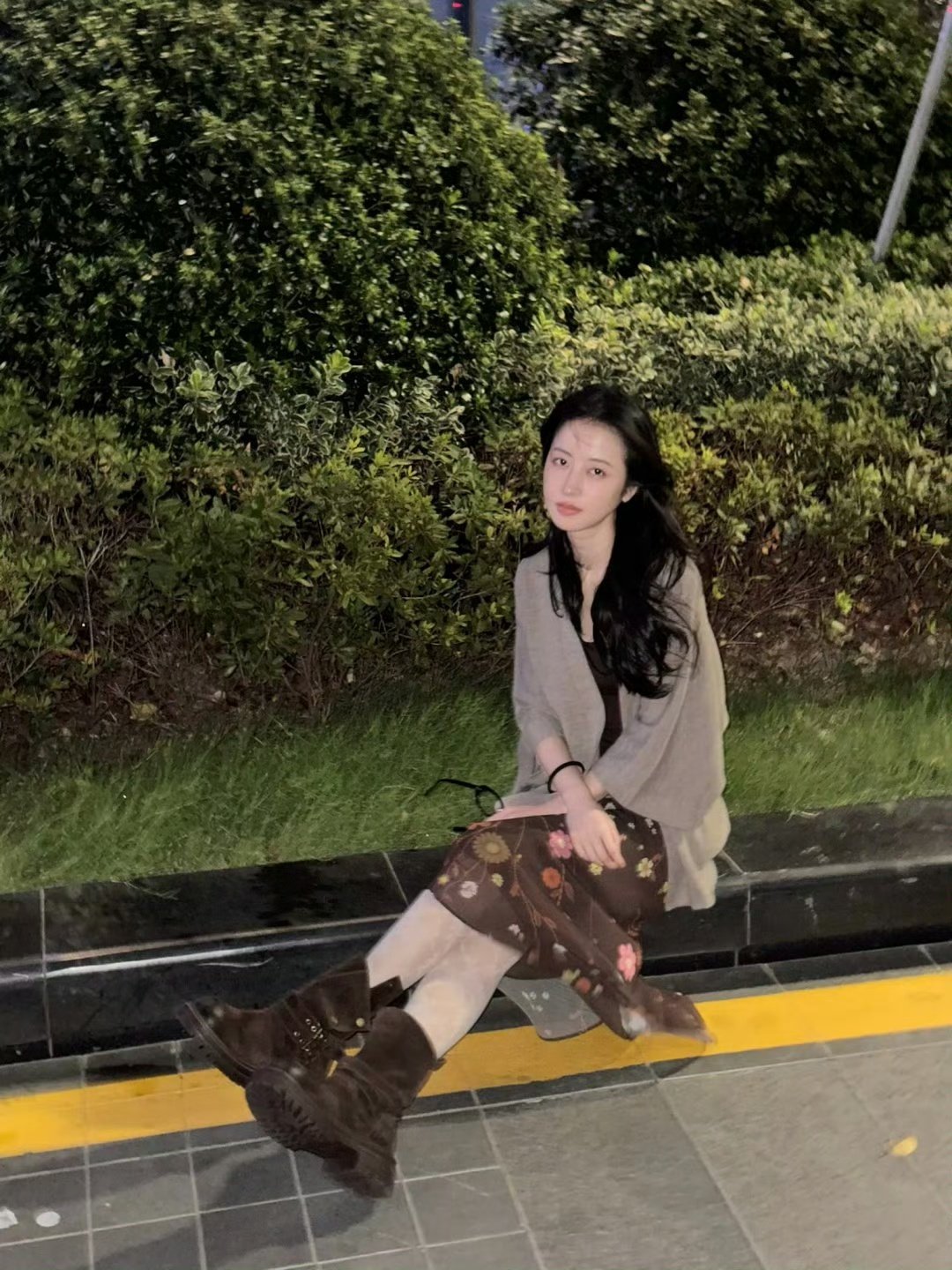 周雨彤棕色印花裙 周雨彤街边闲坐随拍