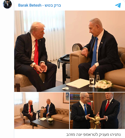 以色列总理内塔尼亚胡赠送给美国总统特朗普一个金制的和平鸽以色列和哈马斯