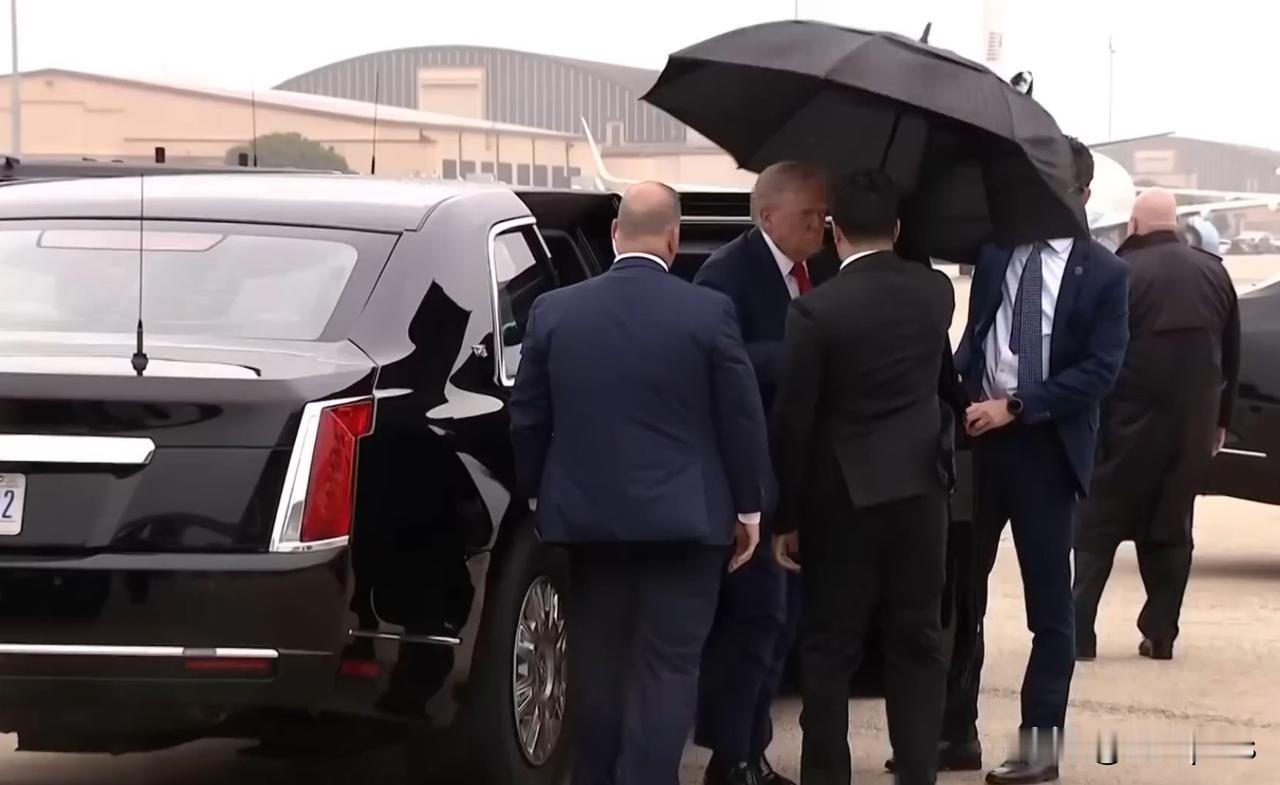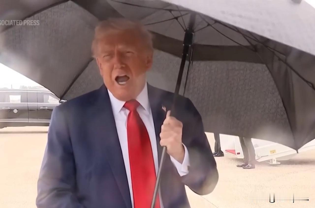 自己打伞的特朗普。在马里兰州安德鲁斯空军基地,特朗普准备乘坐专机时下雨了,特朗普