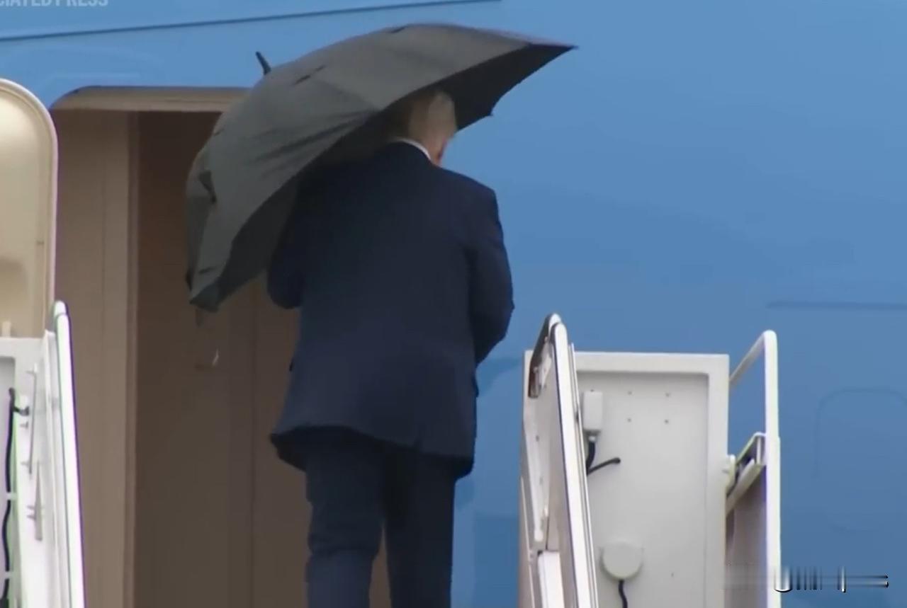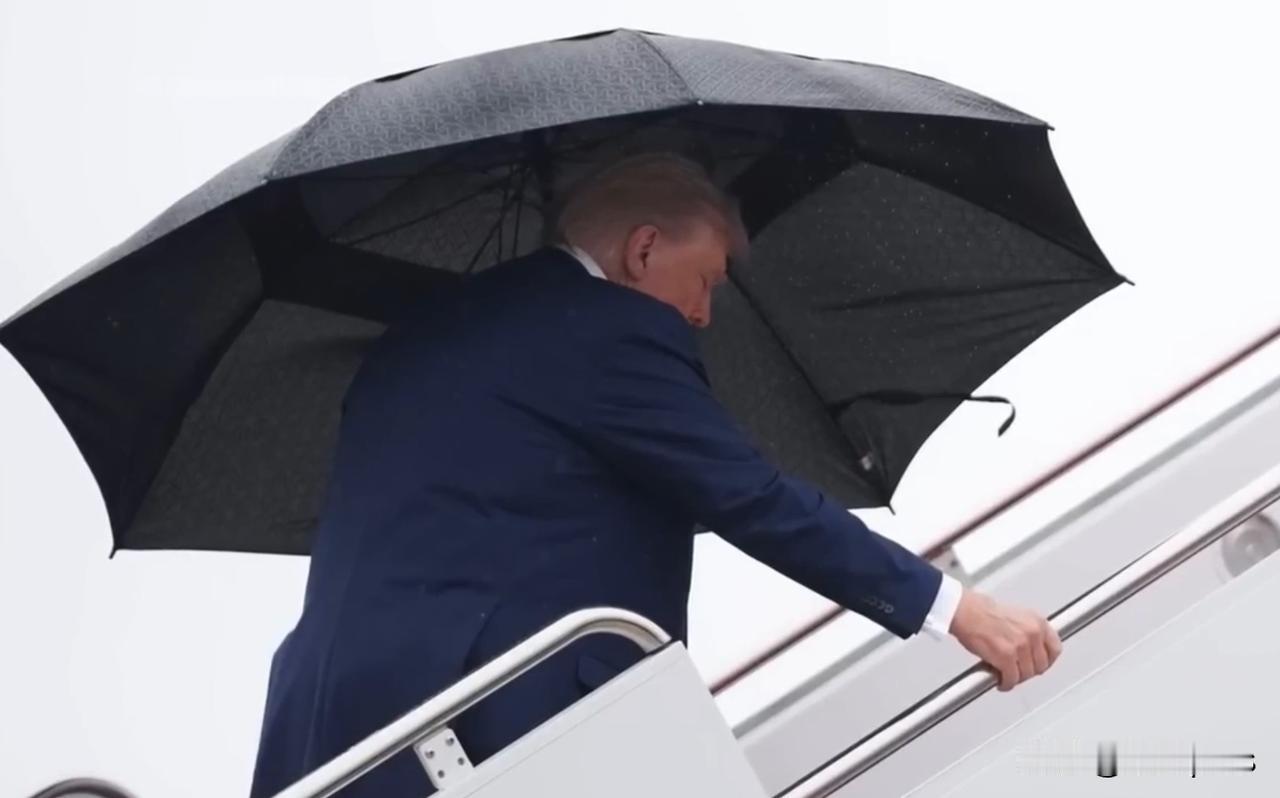自己打伞的特朗普。在马里兰州安德鲁斯空军基地,特朗普准备乘坐专机时下雨了,特朗普拿过伞自己打着。 特朗普还是相当有生活经验,看到当天风比较大,特朗普紧握住伞杆中部,这样可以避免大风把伞吹走。 特朗普在风雨中撑着伞,还接受了记者的采访。特朗普聊了一会之后,就独自打着伞走上飞机。到了机舱口,特朗普回头向人们致意。 这时候风还是很大的,将一侧伞面吹凹进去。特朗普自己艰难地收了伞进了机舱。