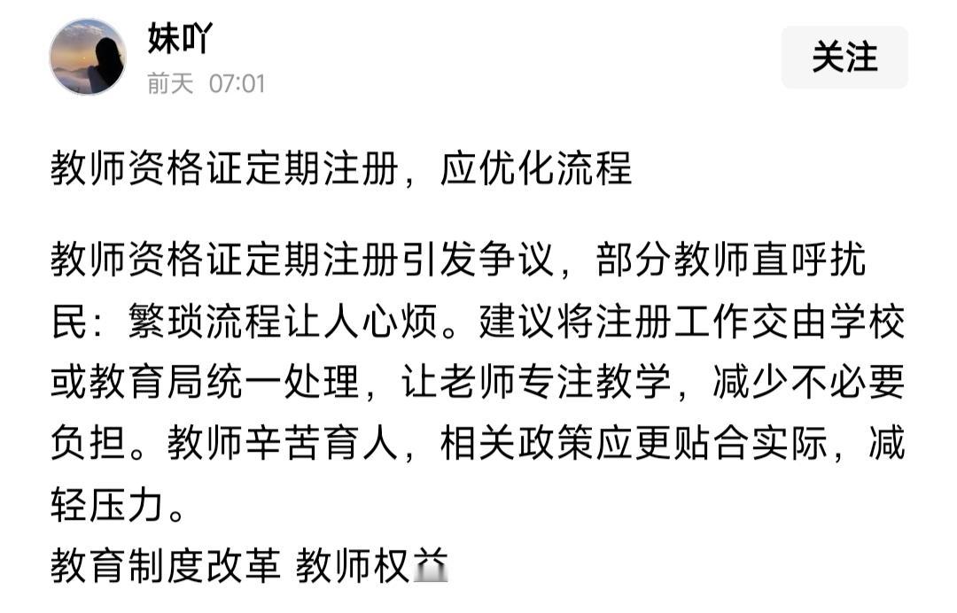 刚才刷到不少老师在吐槽五年一次的教师资格证注册,也有老师呼吁优化流程,简化程序,