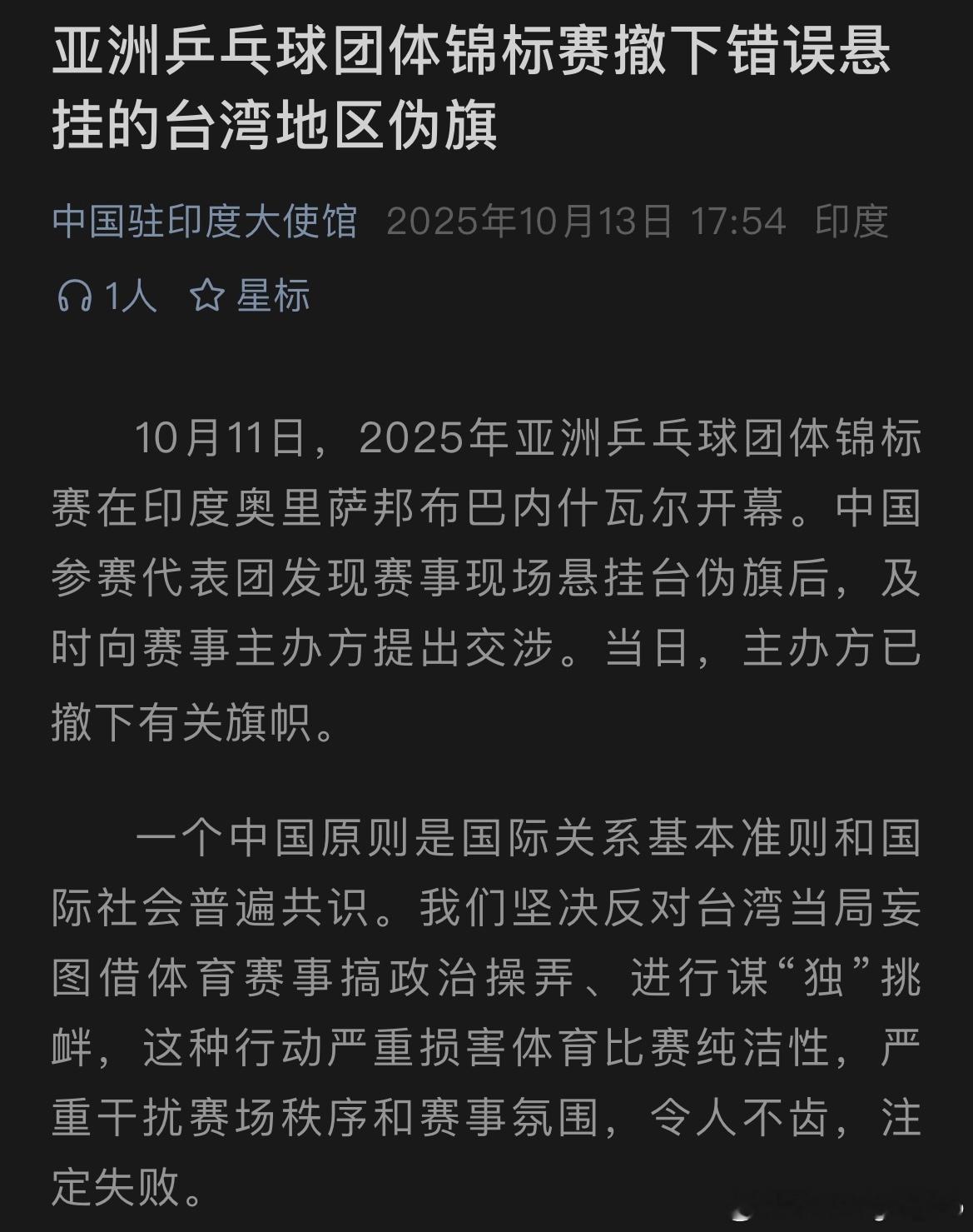 中国驻印度大使馆:10月11日,2025年亚洲乒乓球团体锦标赛在印度奥里萨邦布巴内什瓦尔开幕。中国参赛代表团发现赛事现场悬挂台伪旗后,及时向赛事主办方提出交涉。当日,主办方已撤下有关旗帜。