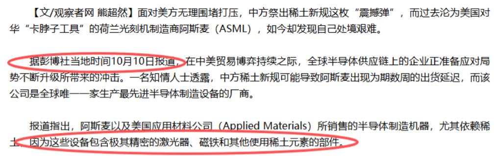 彭博社说了段让人深思的话,他说,中国稀土新规,可能会导致阿斯麦的光刻机无法出货,或者出货延迟。他们明确的说,当下半导体制造机器,尤其依赖稀土,因为这些设备包含极其精密的激光器、磁铁和其他使用稀土元素的部件。 这事儿得从10月9日中国出台的那两项新规说起,可不是随便加了点限制那么简单。一项是管那些含有中国成分的稀土相关产品,哪怕是在国外加工过的,只要源头有中国稀土,出口就得经过批准;另一项更直接,连稀土相关的技术出口也纳入了管制。 官方说得很明白,之前总有人把这些稀土产品和技术拿去搞军事等敏感领域,既威胁咱们的安全,也不利于国际和平,所以才出了这招,而且还留了过渡期,人道主义用途比如医疗救援之类的还能豁免,算是挺讲道理的。 可就这两条规矩,让整个西方都坐不住了,这才真正意识到,原来他们的高科技和现代工业,早就被中国稀土“捆”住了。 先说说阿斯麦那台金贵的光刻机,这机器是造高端芯片的关键,全世界就它能造最先进的EUV型号。可它里面的核心部件,比如控制晶圆移动的磁体,得用钕、镝这些中重稀土才能做出超强磁力,保证零件在纳米级的精度上动起来,差一点都不行;还有激光器里的光学元件,少了铽、铥这些稀土,根本发不出精准的光束。 阿斯麦自己都慌了,赶紧找荷兰和美国求救,想找替代供应,可短期内哪儿那么容易找到?现在已经传出出货要延迟好几周的消息,要是真断了供,台积电、英特尔这些芯片巨头的生产计划都得被打乱。 不止光刻机,西方好多产业都离不开中国稀土。德国汽车业早就喊疼了,他们造新能源汽车的电机,每台都得用稀土做的永磁体,缺了这东西,电机功率上不去,电动车跑不远。德国经济部发言人急着说这事儿“令人极度担忧”,还喊着要把稀土加工搬回本土,可哪有那么快?建个分离提纯厂不仅要花好几年,技术还得从零学起——要知道全世界90%的稀土加工活儿都在中国,这技术壁垒可不是说破就能破的。 美国更头疼,他们自己的稀土磁体市场只占全球3%,F-35战斗机、“战斧”导弹里的关键部件都得靠中国供应,之前五角大楼都曝出过库存只够撑两个月的消息。连搞AI的企业也慌了,有前白宫顾问说要是稀土真断了,美国经济都可能衰退。 其实西方早想摆脱对中国稀土的依赖了。美国砸了不少钱想搞本土开采,可资本家觉得风险太大,没人敢真投钱;欧盟更离谱,9月份还说要去太空挖矿,被人笑是不切实际的空想。 美西方之前总觉得能靠技术卡别人脖子,比如逼着阿斯麦不给中国卖光刻机,2023年连次一级的DUV设备都限制出口。那时候阿斯麦CEO还警告过美国,说这么做早晚反噬自己,可美国不听,现在真应验了——阿斯麦不仅丢了中国这个曾经占营收三成的大市场,现在连自己的设备都快造不出来了,成本还跟着稀土价格往上涨,真是赔了夫人又折兵。 这波新规就像给西方敲了个警钟,让他们终于觉醒:现代工业的“命门”原来攥在中国手里。稀土这东西看着不起眼,却像“工业味精”,小到手机芯片、汽车电机,大到军工装备、航天设备,离了它都玩不转。而中国不光掌控着70%的开采量,更垄断了几乎所有的高端加工能力,想换供应商,短期内根本不现实。欧盟嘴上喊着要中国“保证稳定供应”,却不提自己之前跟着美国搞技术封锁的事儿;美国跳得最凶,可自己连条完整的稀土加工线都没有,说到底还是得靠中国。 说到底,这不是中国故意要卡谁的脖子,而是西方先把技术当成了打压别人的武器。现在中国只是用同样的方式,守住自己的底线,维护国家安全。 那些喊着“高科技停滞”的声音,其实是他们终于看清了现实:全球产业链早就你中有我、我中有你,把别人逼到墙角,自己也得站不稳。阿斯麦的困境就是最好的例子,之前跟着别人限制中国,现在轮到自己缺稀土,这才明白谁都离不开谁。 西方这次的“觉醒”来得不算晚,至少让他们知道,搞霸权主义没用,好好坐下来谈合作,才是保住自己高科技和现代工业的正道。要是还抱着“卡脖子”的心思不放,最后受影响的,只会是他们自己的发展节奏。