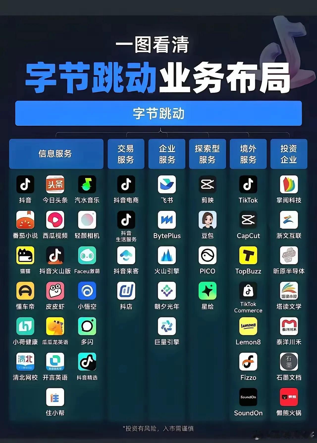 字节跳动早已超越“抖音母公司”的标签,其业务版图横跨信息服务、交易服务、企业服务、探索型服务及境外服务五大领域。旗下不仅有抖音、今日头条等国民级应用,还布局了电商、教育、健康、企业协作、智能硬件乃至半导体等多元赛道。通过飞书、巨量引擎、TikTok、CapCut等产品,字节跳动正深度渗透全球用户的办公、娱乐与商业生态,展现出惊人的跨界能力与战略野心。