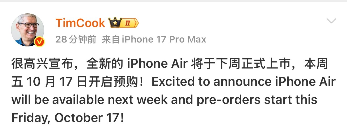官宣了,iPhone Air将于10月17日开启预购,下周五正式开售。各位要不要去当第一个吃螃蟹的?👀