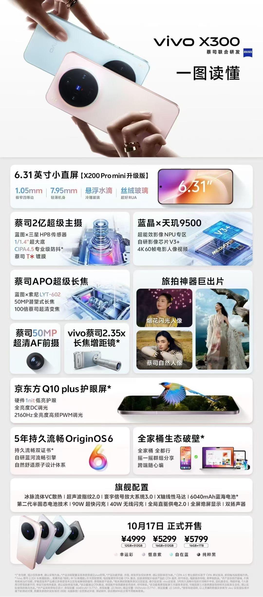 vivo X300系列vivo X300 正式发布,12+512GB版本4999元起,蔡司影像+小直屏旗舰,“影像小王”实至名归!