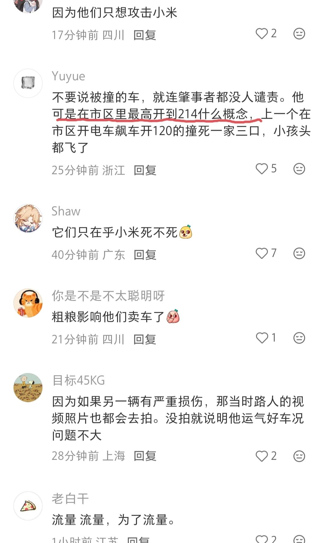 “某米小车发生碰撞后燃烧”事件的相关评论区,看到多条评论说这台车当时最高时速开到了214,我不知道214这个数值是哪里来的,官方有发布过这个信息吗? 更让人颠覆三观的是,居然有这样的评论:“酒驾被烧死,我只能说某米干得好”。这都是什么狗屁理论,书读到狗肚子里面去了吗?“死者为大”不知道吗?即便他再十恶不赦,也不必对一个死者、一个陌生人怀有这么大的敌意吧? 大家觉得呢?