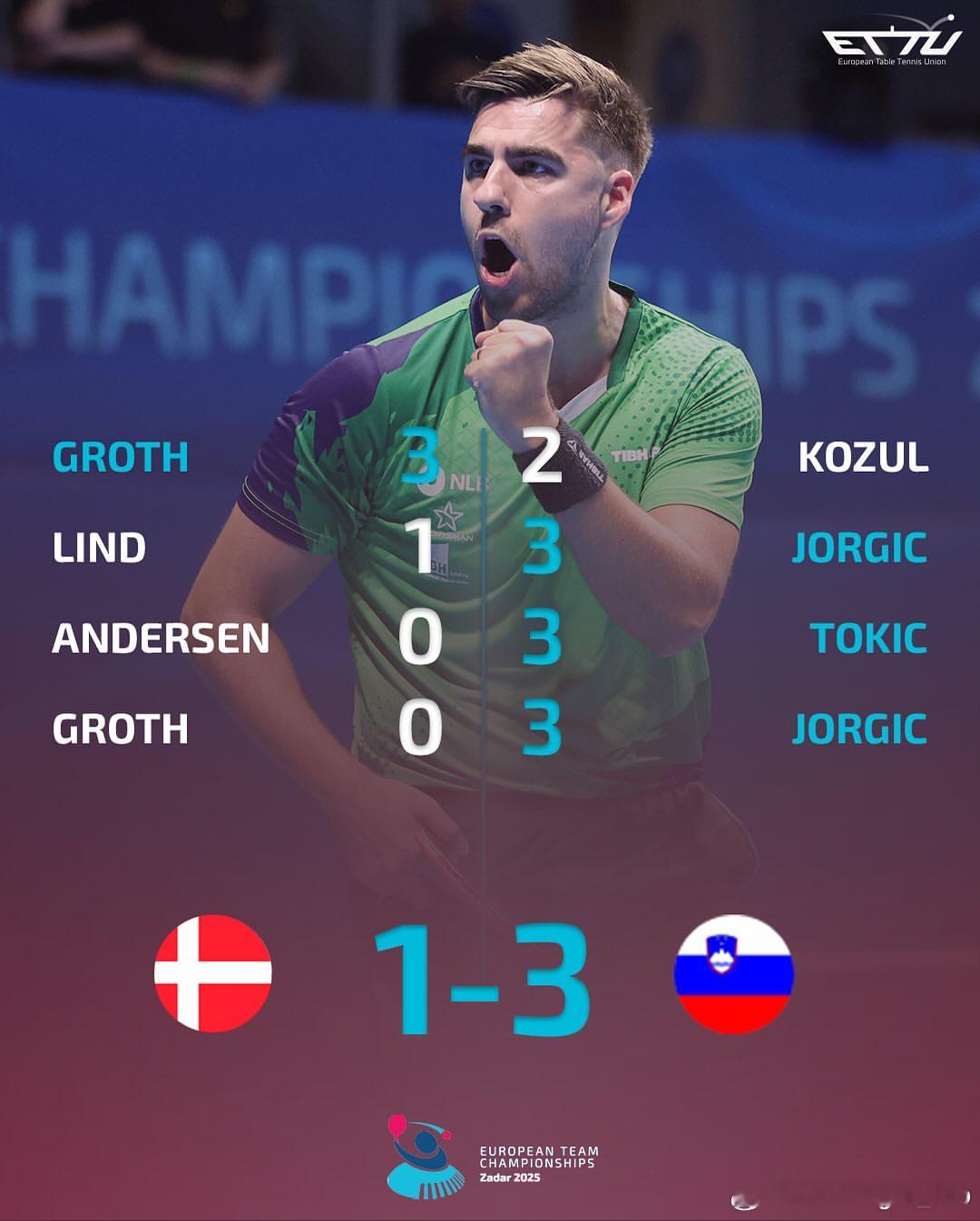 欧锦赛男团小组赛🇸🇮斯洛文尼亚3比1丹麦🇩🇰达科3-1林德,3-0格罗