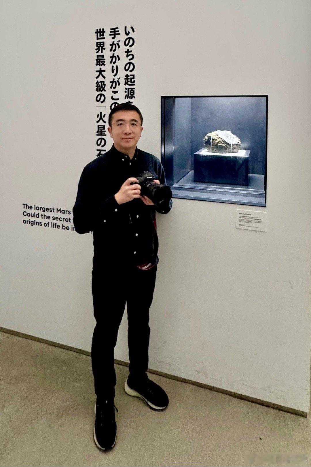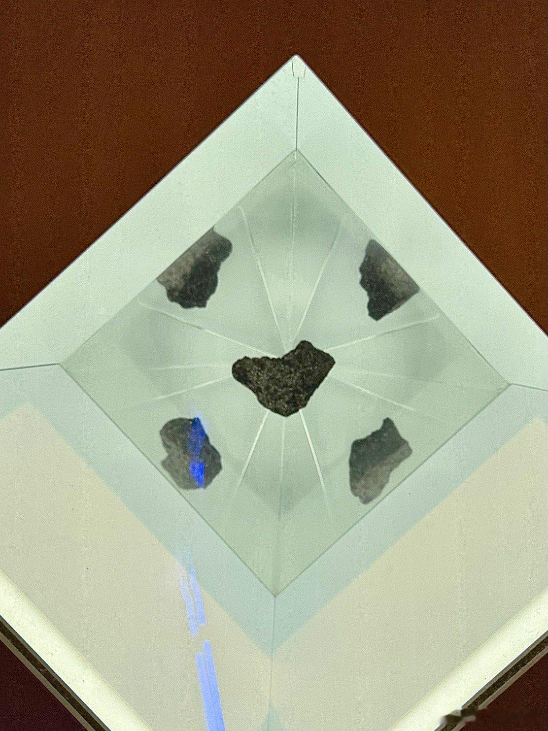 展厅里里面有很多文物复制品,有24节气主题的圆形屏幕和12时辰主题的长屏幕。一个重点展品是月球背面的月壤,是稀罕物。这类的展品我只看到三个馆有,另一个是美国馆,展出从月球上拿回来的石头(图5)。图6是日本馆的镇馆之宝,全世界已知最大的火星石,是日本科学家在南极发现的火星陨石。这是这次世博会的明星展品,数以万计的人排大队就为了看它。