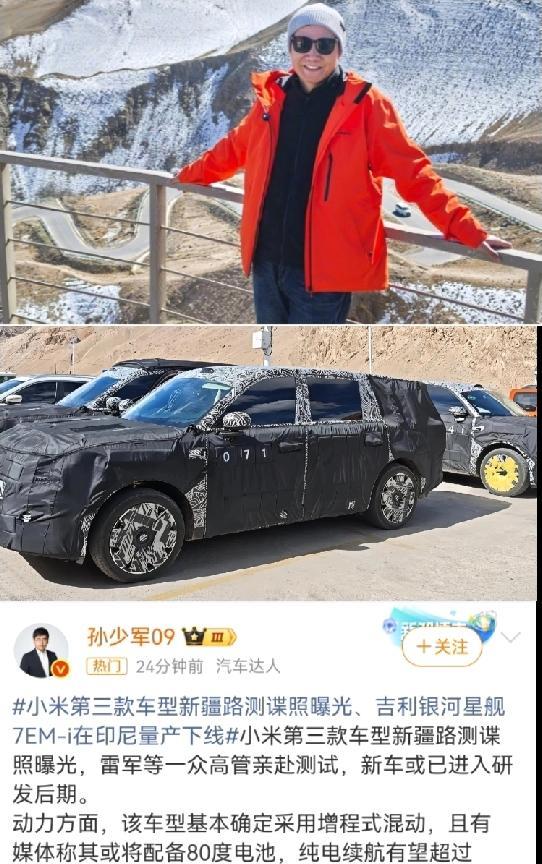 第三款车-伸向混动领域?雷总又来搞事情! 小米汽车老总雷军亲率团队跑到新疆帕米尔高原搞测试,对向是一款大型SUV,大家都叫它YU9,且从车Fans孙少军透露,这款车有点搞头: 1、采用增程混合动力形式。 2、可能装配80度电池,纯电续航也能达到400公里。 3、车身尺寸硕大!长可能超过5.2米、高超1.8米,空间在9系列中算是佼佼者。 此次测试,将对极端环境的续航、充电和环境适应性进行验证,雷总越干越认真了[机智]
