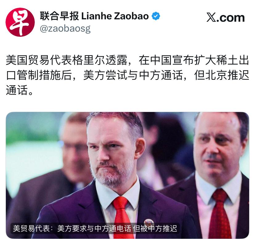 联合早报13日报道:“美国贸易代表格里尔透露,在中国宣布扩大稀土出口管制措施后,美方尝试与中方通话,但北京推迟通话。” 评几句:中方推迟通话,本质是手握稀土这张“战略王牌后的从容回应。中国在稀土冶炼分离环节占全球92.3%的份额,重稀土供应更是掌控99%的市场,而美国F-35战机、核潜艇等核心装备高度依赖这些资源。这种“你急我不急”的姿态,打破了美方以往用施压逼谈的套路,说明博弈节奏已开始由中方主导。 美方一边威胁对中国商品加征100%关税、搞关键软件封锁,一边又急着求通话解决稀土困境,这种“又打又要”的矛盾操作,被中方用“推迟通话”直接点破。中方用行动表明,对话需要对等尊重,而非美方“施压-求和-再施压”的反复套路,这是对其单边霸凌逻辑的有力回击。 稀土管制措施11月8日生效,恰好在美方关税生效(11月1日)之后、贸易战缓冲期结束之前,这个时间差本就给谈判留了空间。推迟通话并非拒绝沟通,而是为了让美方充分认识到稀土管制对其军工、科技产业链的实质冲击——美国自建稀土产业链需8年和数百亿美元,短期内根本无法替代中方供应,从而在后续对话中拿出更务实的态度。