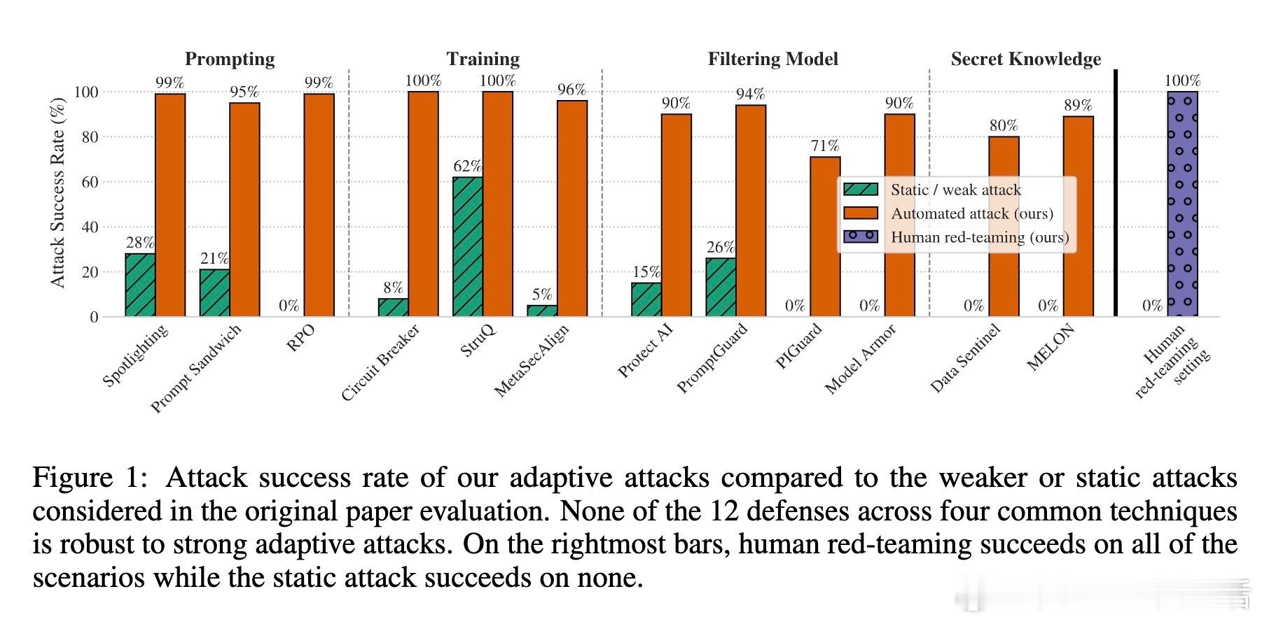 - 在AgentDojo、HarmBench等多种基准测试上,自动化和人类攻击者均轻易攻破所有防御。