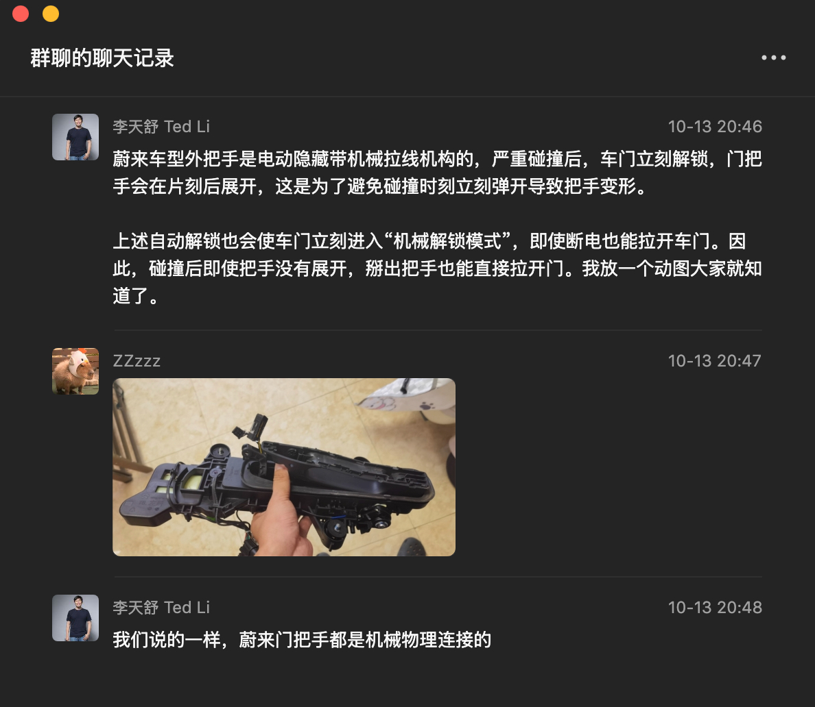 这几天一直在跑没时间发博,打开微博全是车祸燃烧无法开门的视频。看到这个我觉得可以分享出来,大家记住蔚来的车门是物理连接的,在碰撞后会解锁并弹起,可以掰起并顺利拉开车门。如果大家遇到不幸撞击的蔚来,可以通过这个方式施救。再次希望大家出行平安,永远也不要用上这个功能。明天回国了,恢复正常更新。