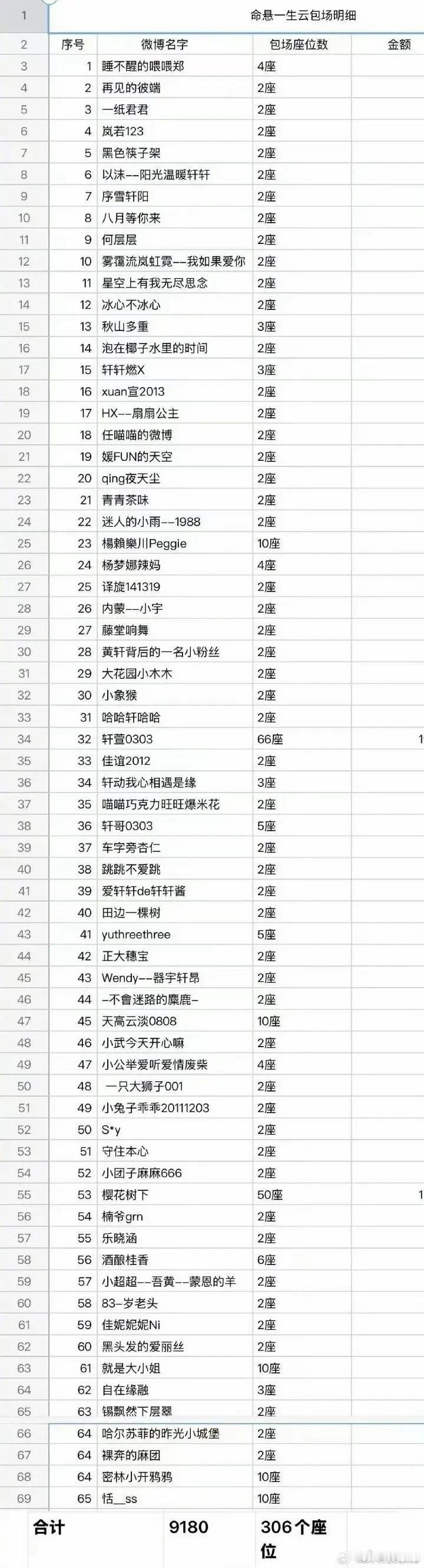 黄轩把给命悬一生云包场的粉丝名单列了一个小表格,特意发出来感谢,他这是在鼓励粉丝云包场?现在谁还敢说粉丝不重要,粉丝很重要啊,黄轩年轻的时候也合作过好多85流量🌸,结果还是没有吸粉丝做大流量的命……