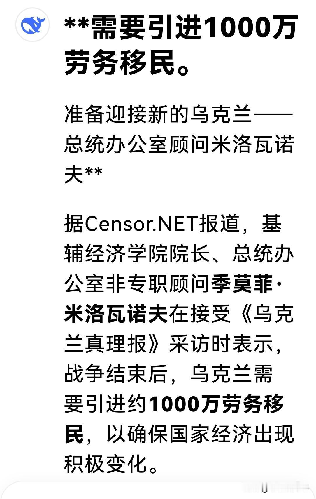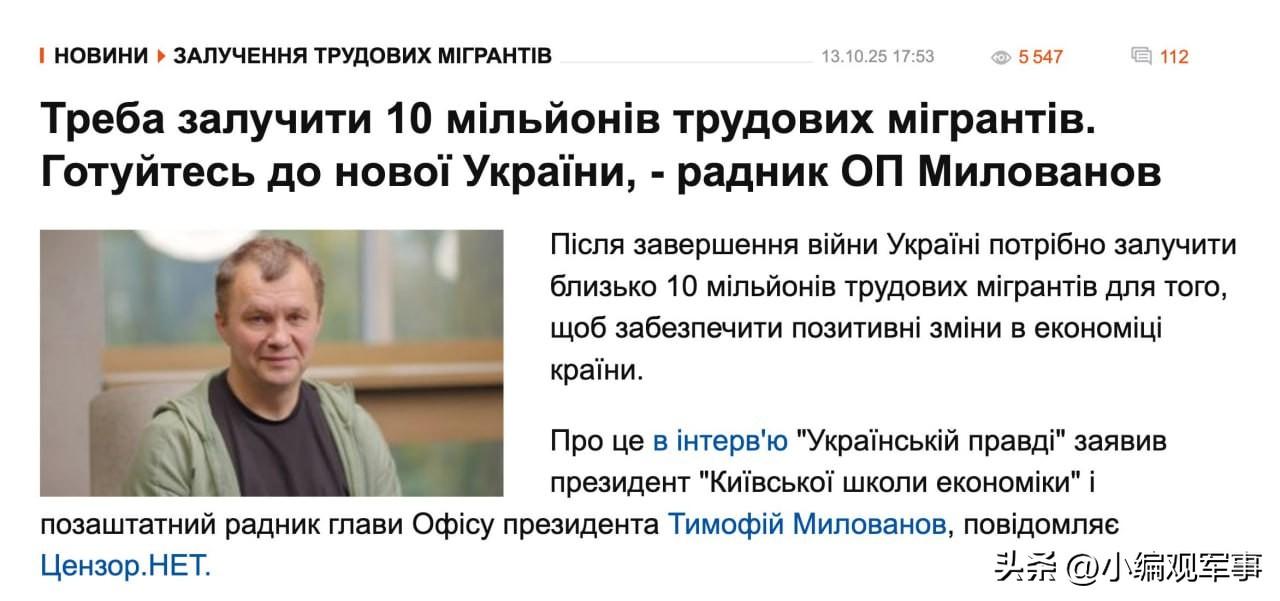 🇺🇦乌克兰总统办公室顾问米洛瓦诺夫表示,俄乌战争结束后,乌克兰需要引进约1000万名劳工。 乌克兰问题 乌克兰经济 乌克兰人口问题 乌现状 乌克兰局势 乌克兰