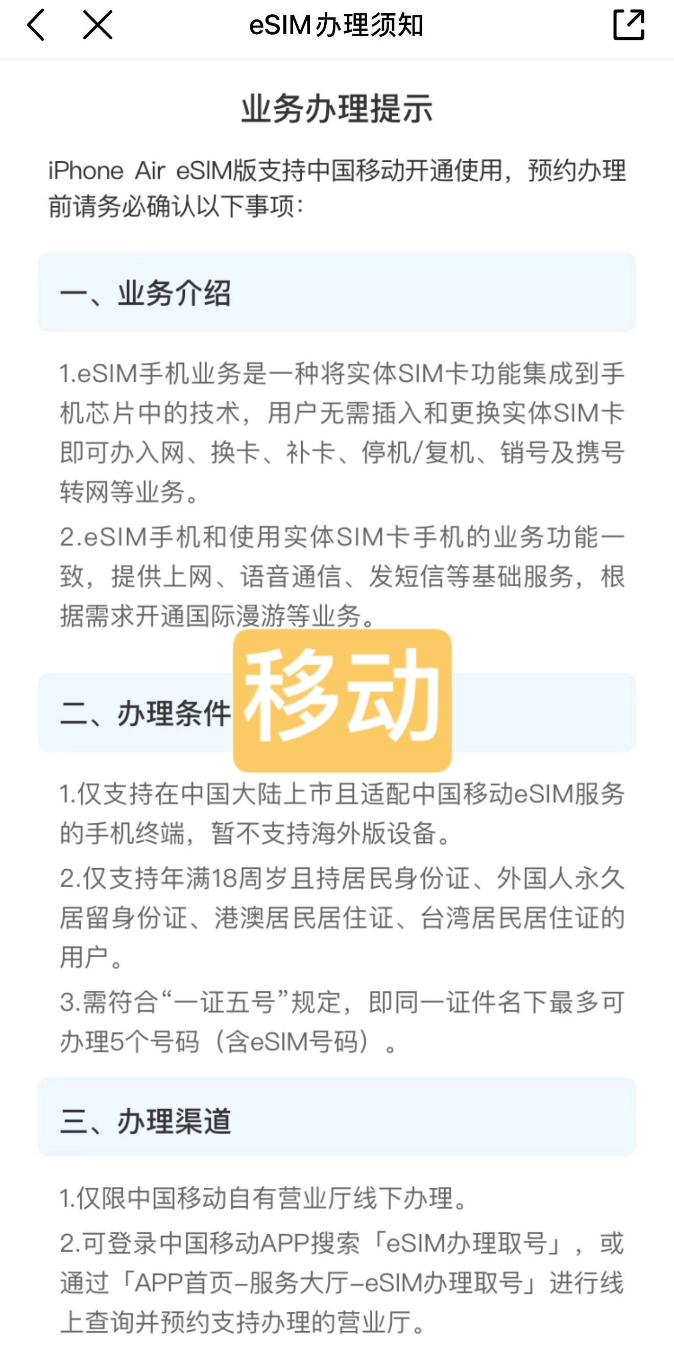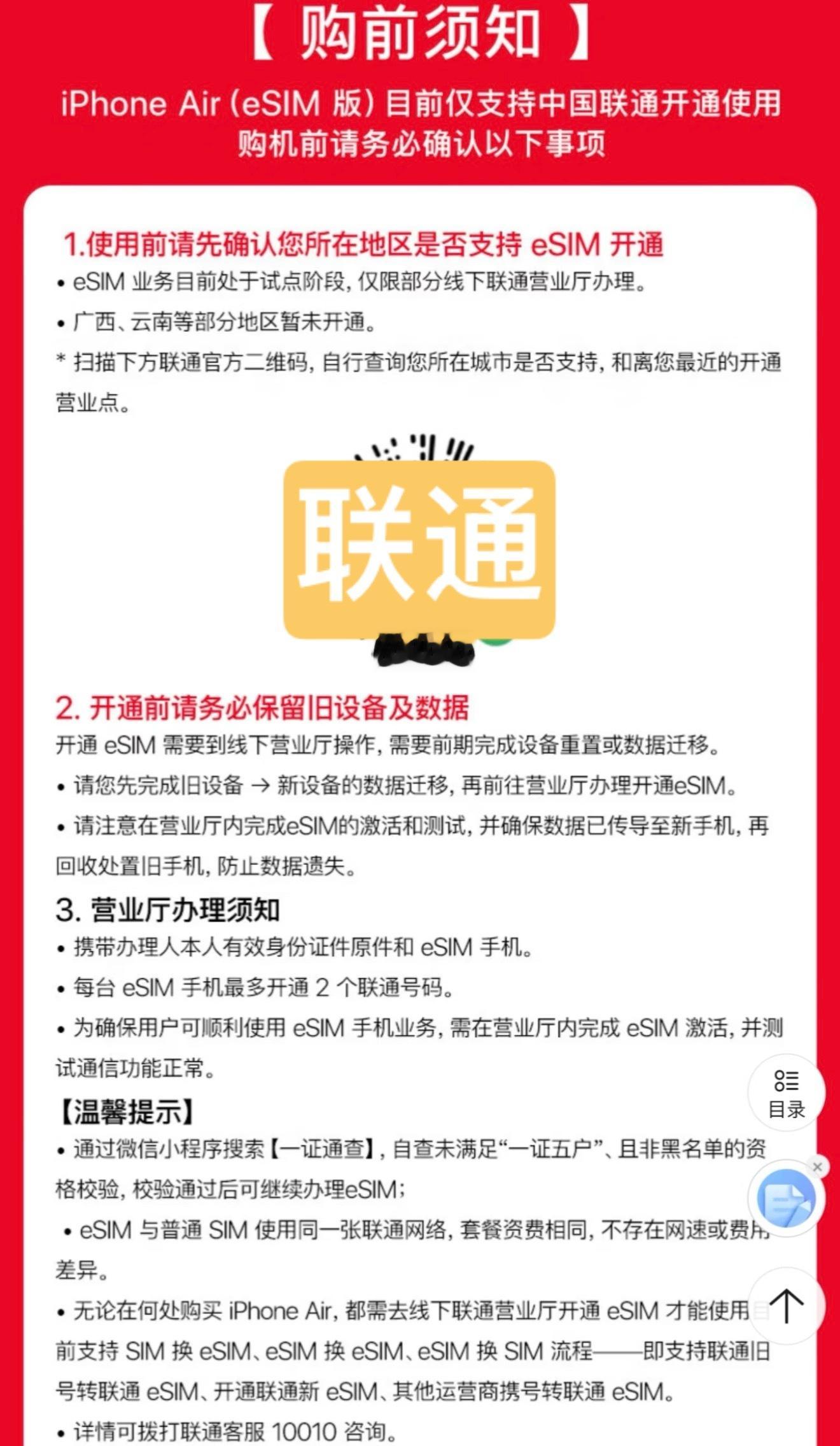统一重点:只要你从官方渠道购买的iPhone Air都可以到相应运营商办理eSIM,且非合约机性质,不受资费期限束缚。另国内只有iPhone Air可开通eSIM,其余国行17系列均不可使用(非国行17系列可用eSIM,但又不支持国内运营商,形成死循环)
