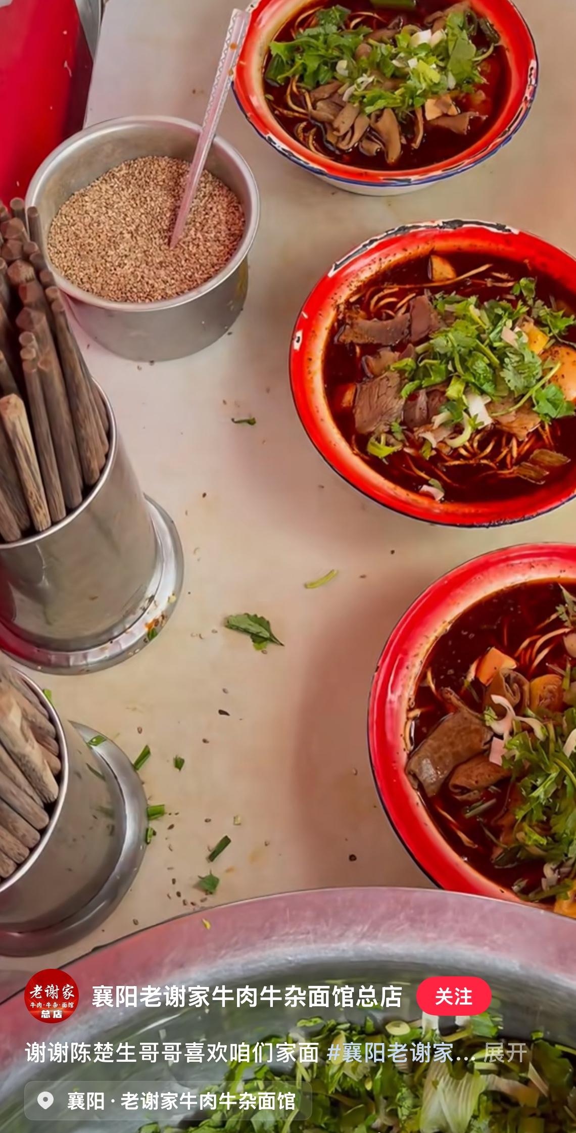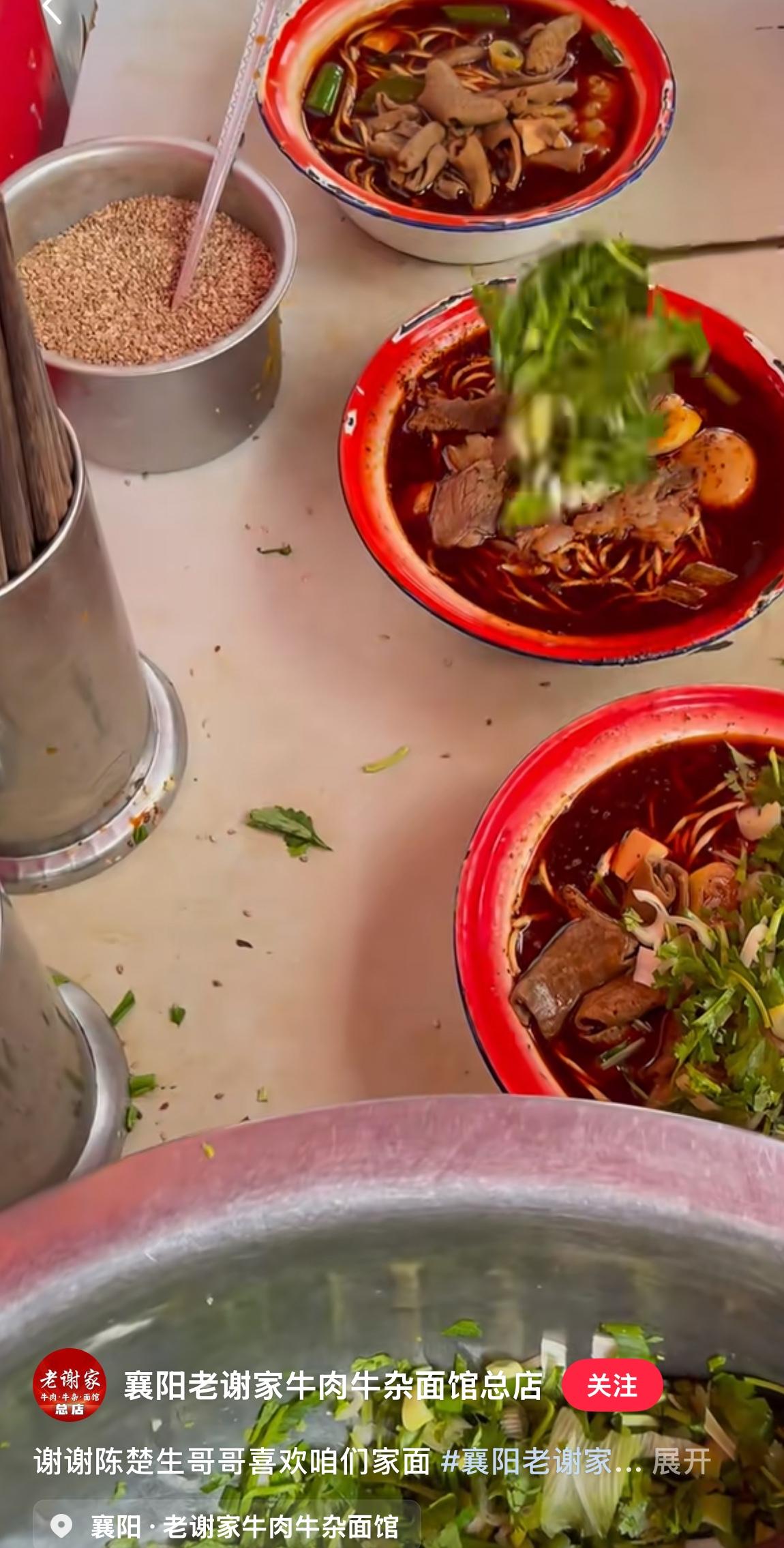 襄阳这家老谢家牛肉面因为陈楚生火了! 一早就刷到了这家店。 还有很多网友晒打卡视频,坐同一样的位置、吃同款面! 这就是明星效应吧。 不过有网友说这家面有点咸,面条量不大,牛油味太重。 还有当地网友声称这并不是最好吃的一家。 不管怎样,这家店还是很会借势宣传的,这波流量稳稳地接住了。