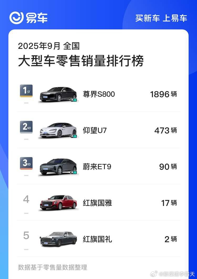 9月,尊界S800 交付1,896台,大概率拿下大型车销量榜首~